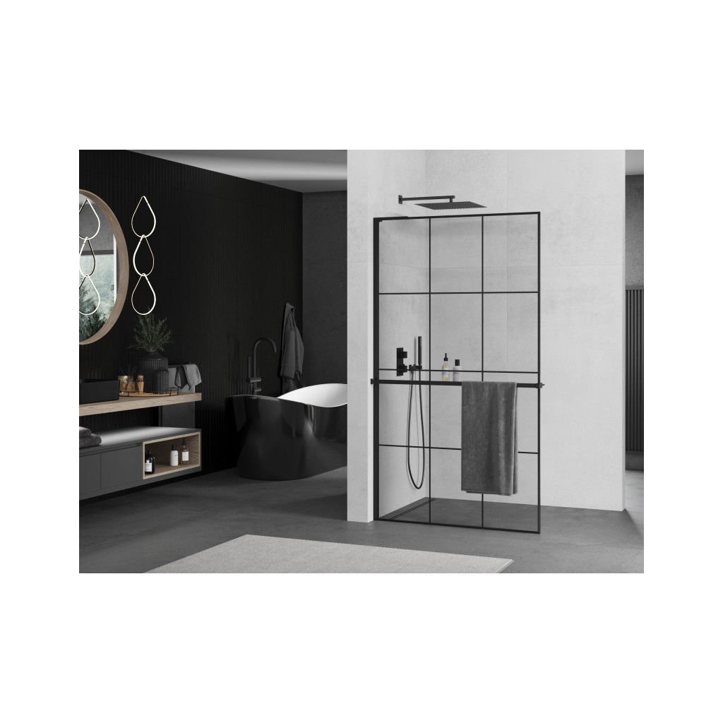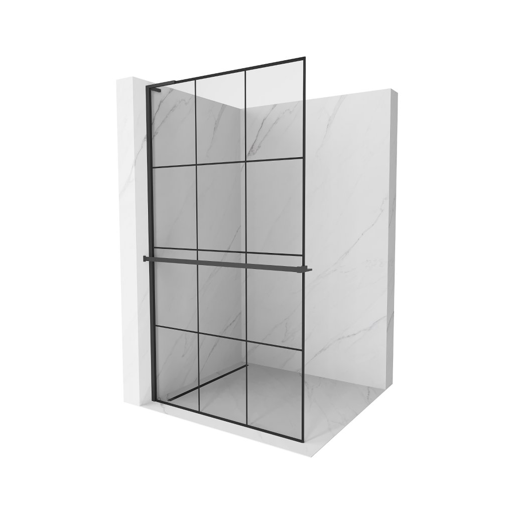 Mexen Kioto+ L, sprchová zástena Walk-In s poličkou a vešiakom 110 x 200 cm, 8mm číre sklo čierny vzor, čierny profil, 800-110-123-70-77