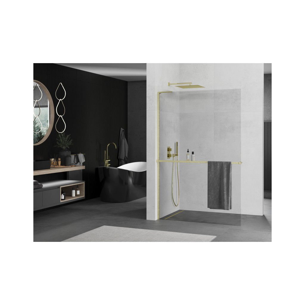 Mexen Kioto+ L, sprchová zástena Walk-In s poličkou a vešiakom 120 x 200 cm, 8mm číre sklo, zlatý matný profil, 800-120-123-55-00
