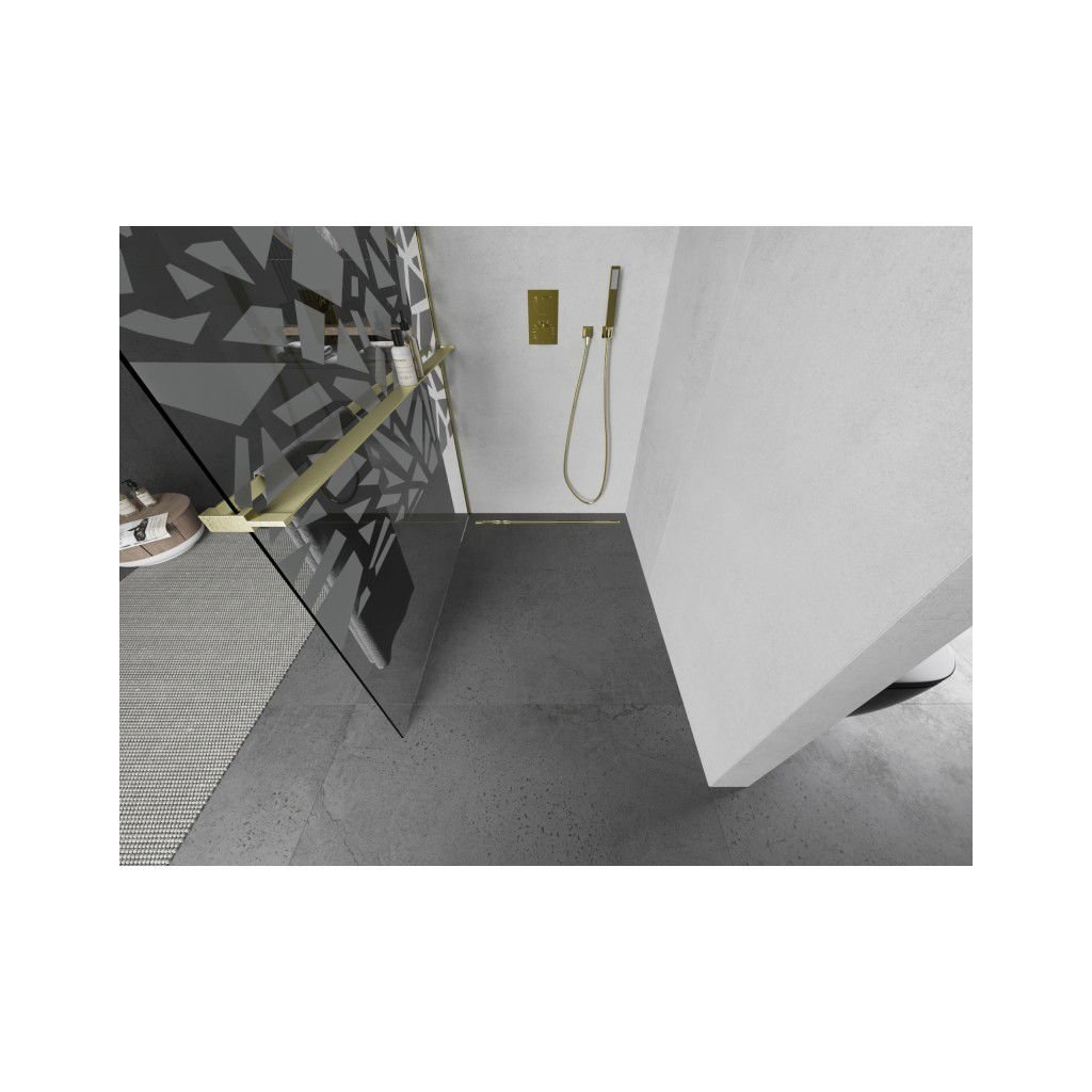 Mexen Kioto+ L, sprchová zástena Walk-In s poličkou a vešiakom 120 x 200 cm, 8mm číre sklo biely vzor, zlatý matný profil, 800-120-123-55-85
