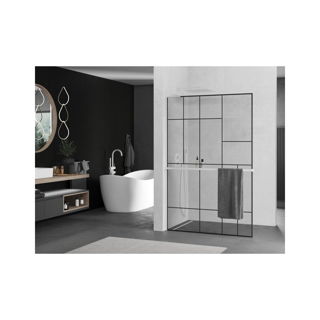 Mexen Kioto+ L, sprchová zástena Walk-In s poličkou a vešiakom 120 x 200 cm, 8mm číre sklo čierny vzor, biely profil, 800-120-123-20-78