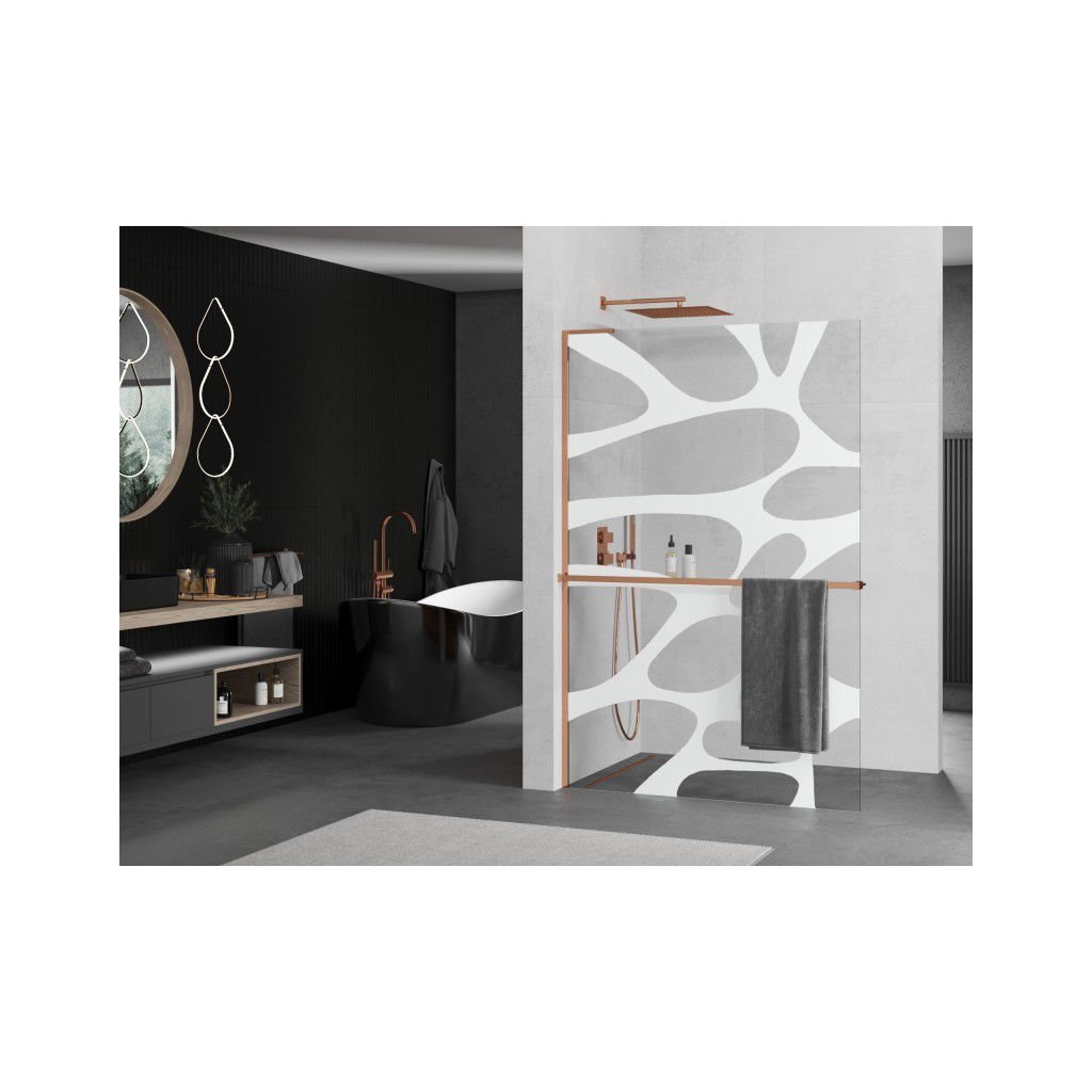 Mexen Kioto+ L, sprchová zástena Walk-In s poličkou a vešiakom 70 x 200 cm, 8mm číre sklo biely vzor, ružové zlato profil, 800-070-123-60-97