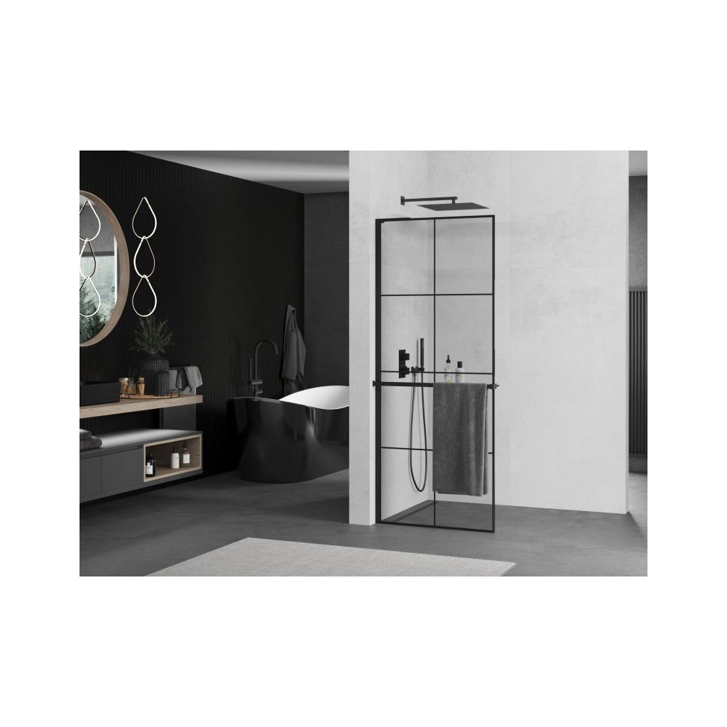 Mexen Kioto+ L, sprchová zástena Walk-In s poličkou a vešiakom 70 x 200 cm, 8mm číre sklo čierny vzor, čierny profil, 800-070-123-70-77