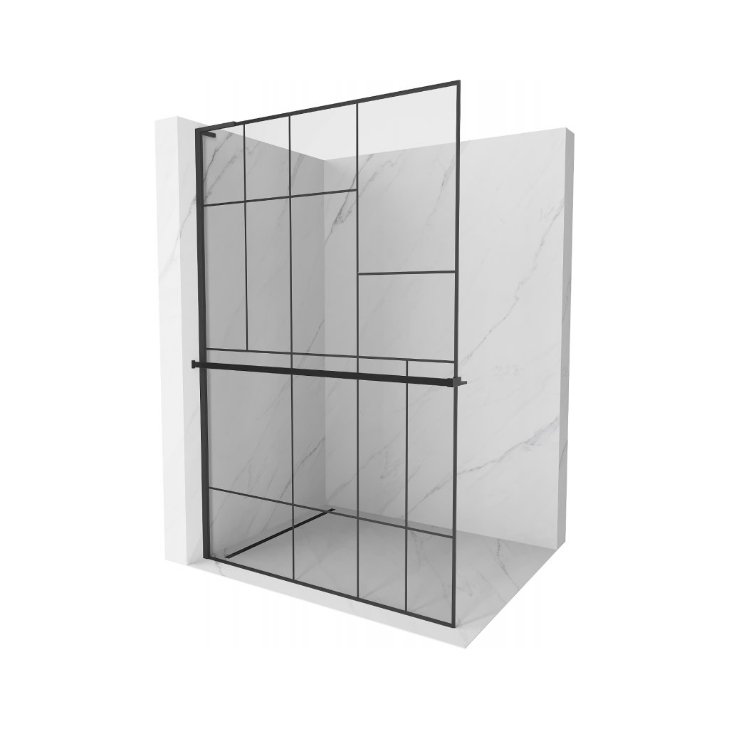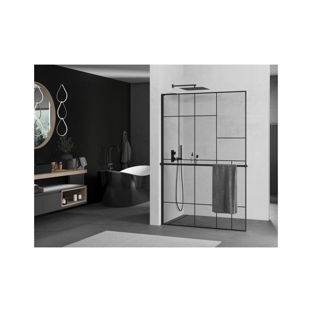 Mexen Kioto+ L, sprchová zástena Walk-In s poličkou a vešiakom 70 x 200 cm, 8mm číre sklo čierny vzor, čierny profil, 800-070-123-70-78