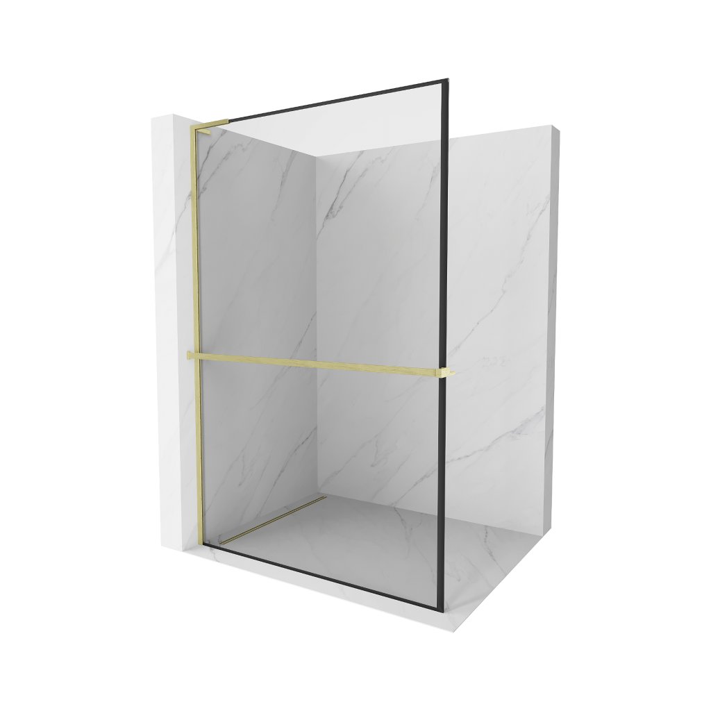 Mexen Kioto+ L, sprchová zástena Walk-In s poličkou a vešiakom 70 x 200 cm, 8mm číre sklo čierny vzor, zlatý matný profil, 800-070-123-55-70