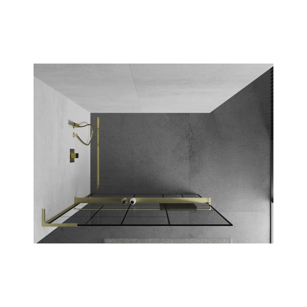 Mexen Kioto+ L, sprchová zástena Walk-In s poličkou a vešiakom 70 x 200 cm, 8mm číre sklo čierny vzor, zlatý matný profil, 800-070-123-55-78