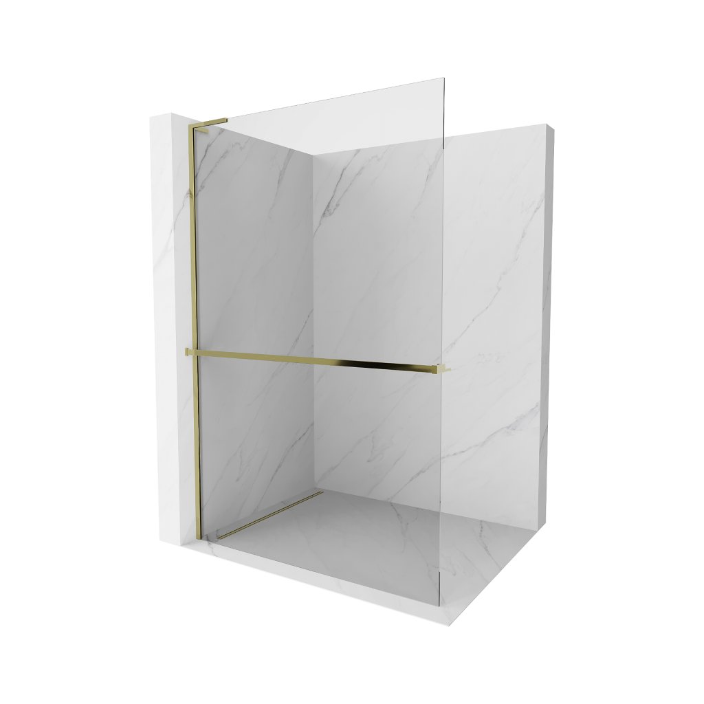 Mexen Kioto+ L, sprchová zástena Walk-In s poličkou a vešiakom 80 x 200 cm, 8mm číre sklo, zlatý lesklý profil,800-080-123-50-00