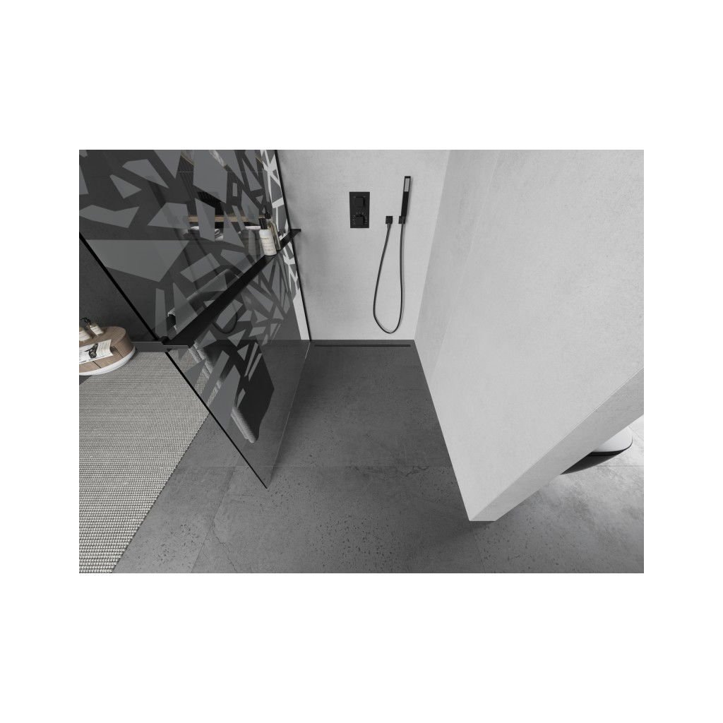 Mexen Kioto+ L, sprchová zástena Walk-In s poličkou a vešiakom 80 x 200 cm, 8mm číre sklo biely vzor, čierny profil, 800-080-123-70-85