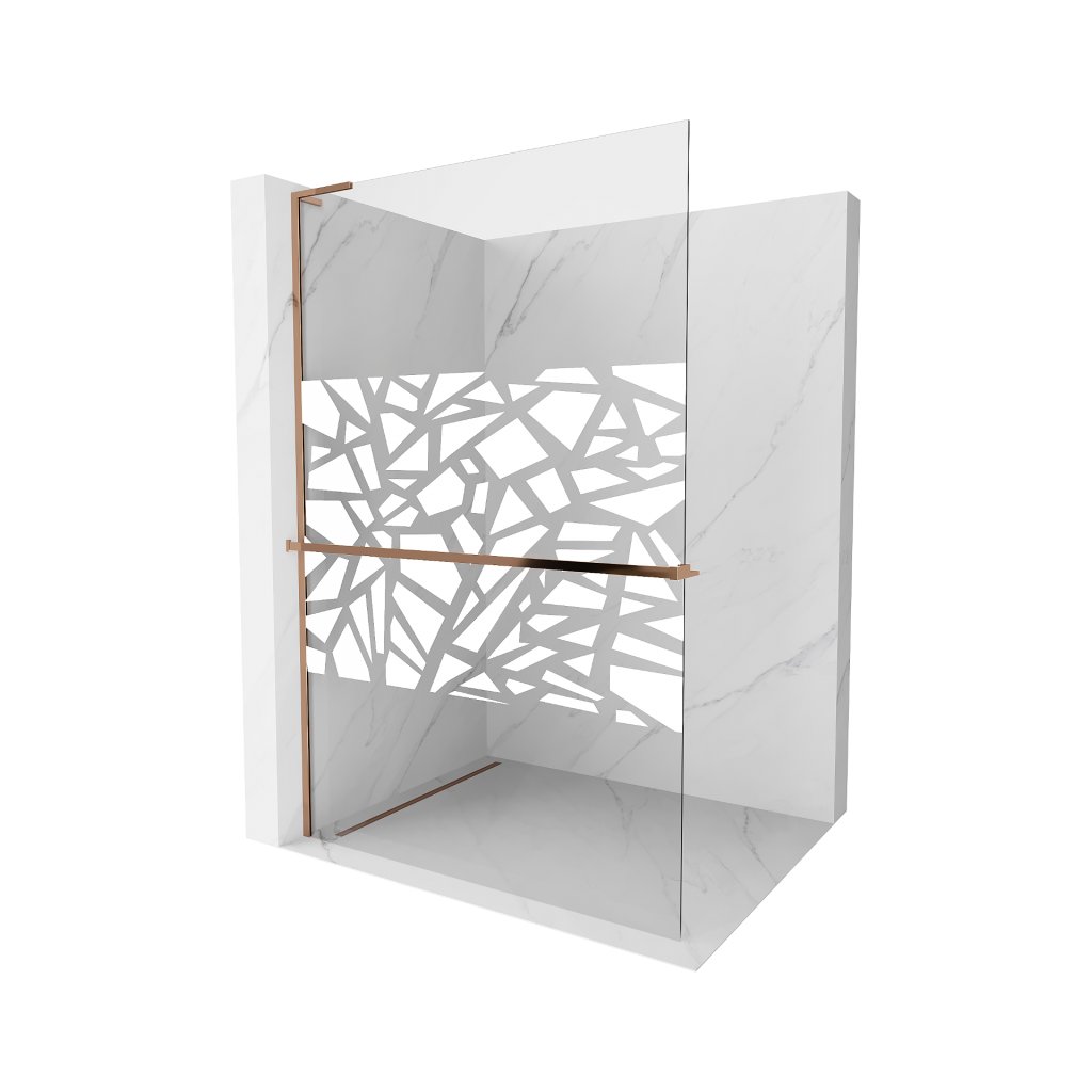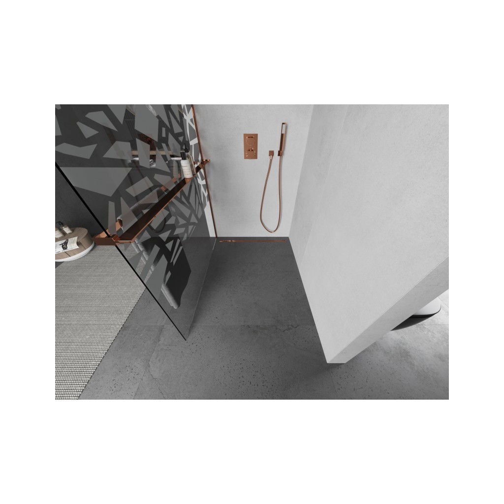 Mexen Kioto+ L, sprchová zástena Walk-In s poličkou a vešiakom 80 x 200 cm, 8mm číre sklo biely vzor, ružové zlato profil, 800-080-123-60-85