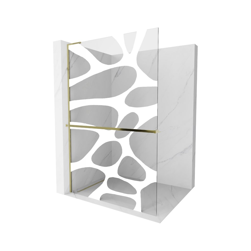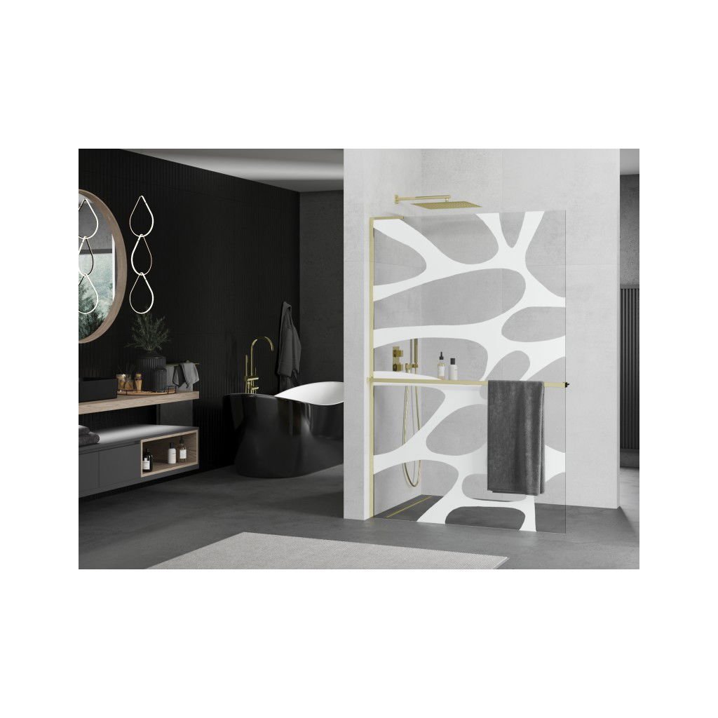 Mexen Kioto+ L, sprchová zástena Walk-In s poličkou a vešiakom 80 x 200 cm, 8mm číre sklo biely vzor, zlatý lesklý profil,800-080-123-50-97