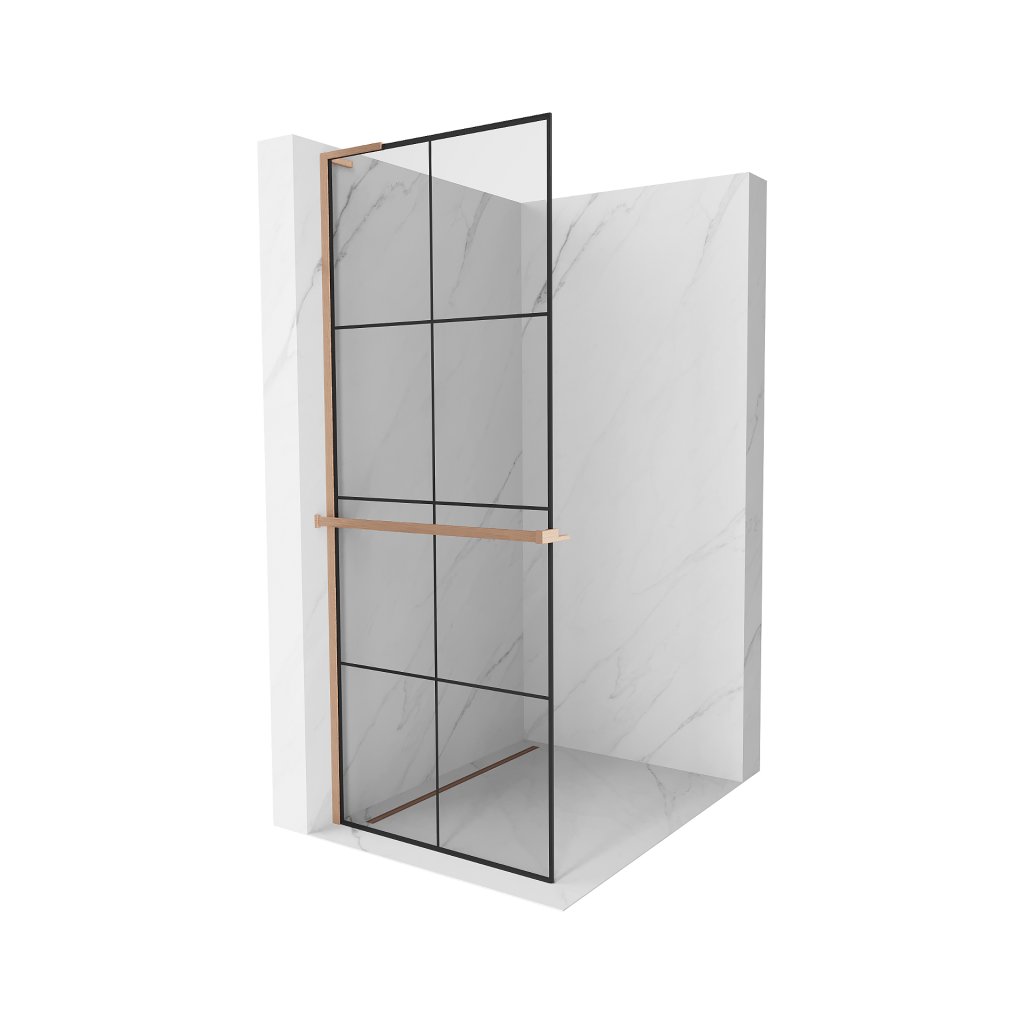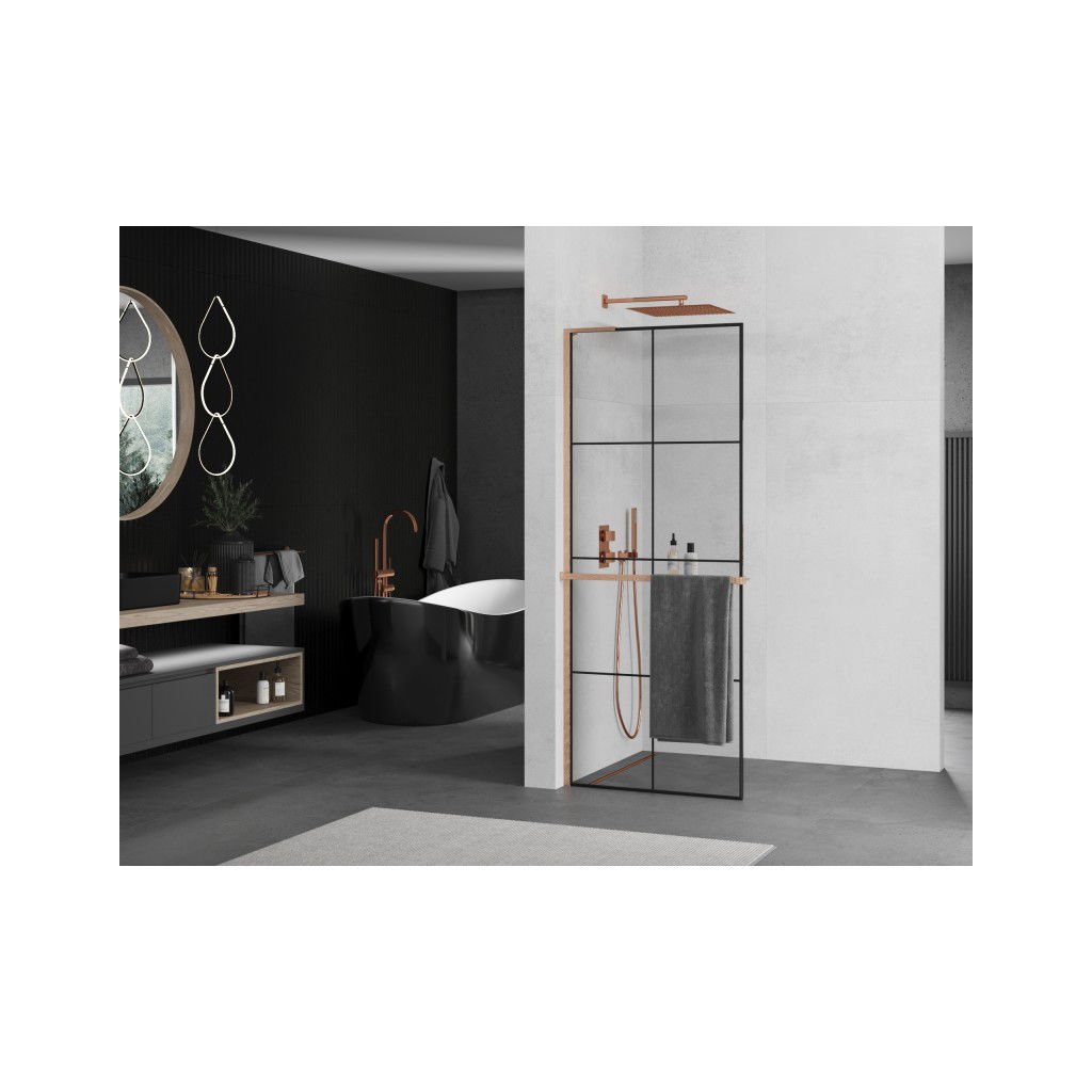 Mexen Kioto+ L, sprchová zástena Walk-In s poličkou a vešiakom 80 x 200 cm, 8mm číre sklo čierny vzor, medený matný profil, 800-080-123-65-77
