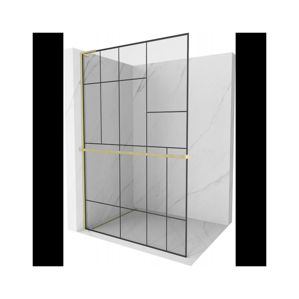 Mexen Kioto+ L, sprchová zástena Walk-In s poličkou a vešiakom 80 x 200 cm, 8mm číre sklo čierny vzor, zlatý matný profil, 800-080-123-55-78