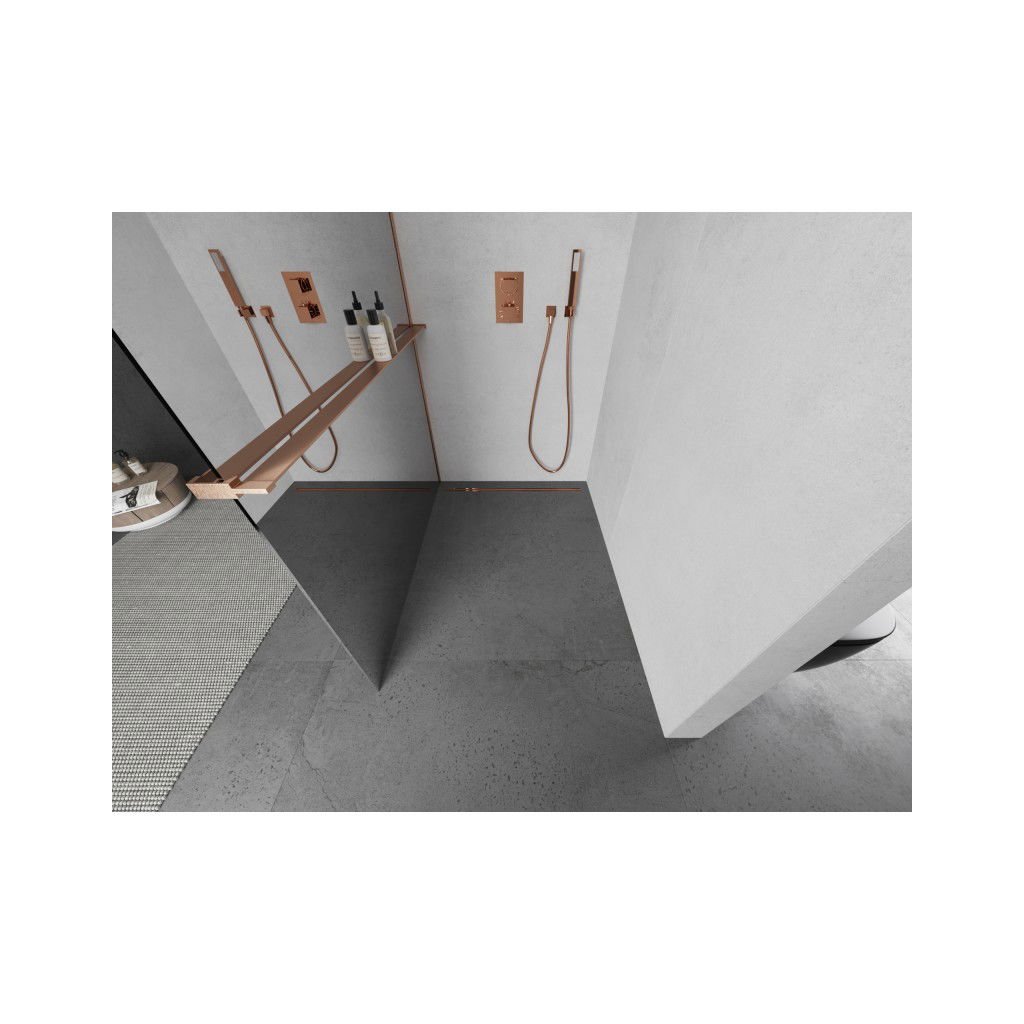 Mexen Kioto+ L, sprchová zástena Walk-In s poličkou a vešiakom 80 x 200 cm, 8mm sklo vzor zrkadlo, medený matný profil, 800-080-123-65-50