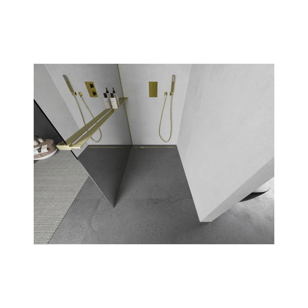 Mexen Kioto+ L, sprchová zástena Walk-In s poličkou a vešiakom 80 x 200 cm, 8mm sklo vzor zrkadlo, zlatý matný profil, 800-080-123-55-50