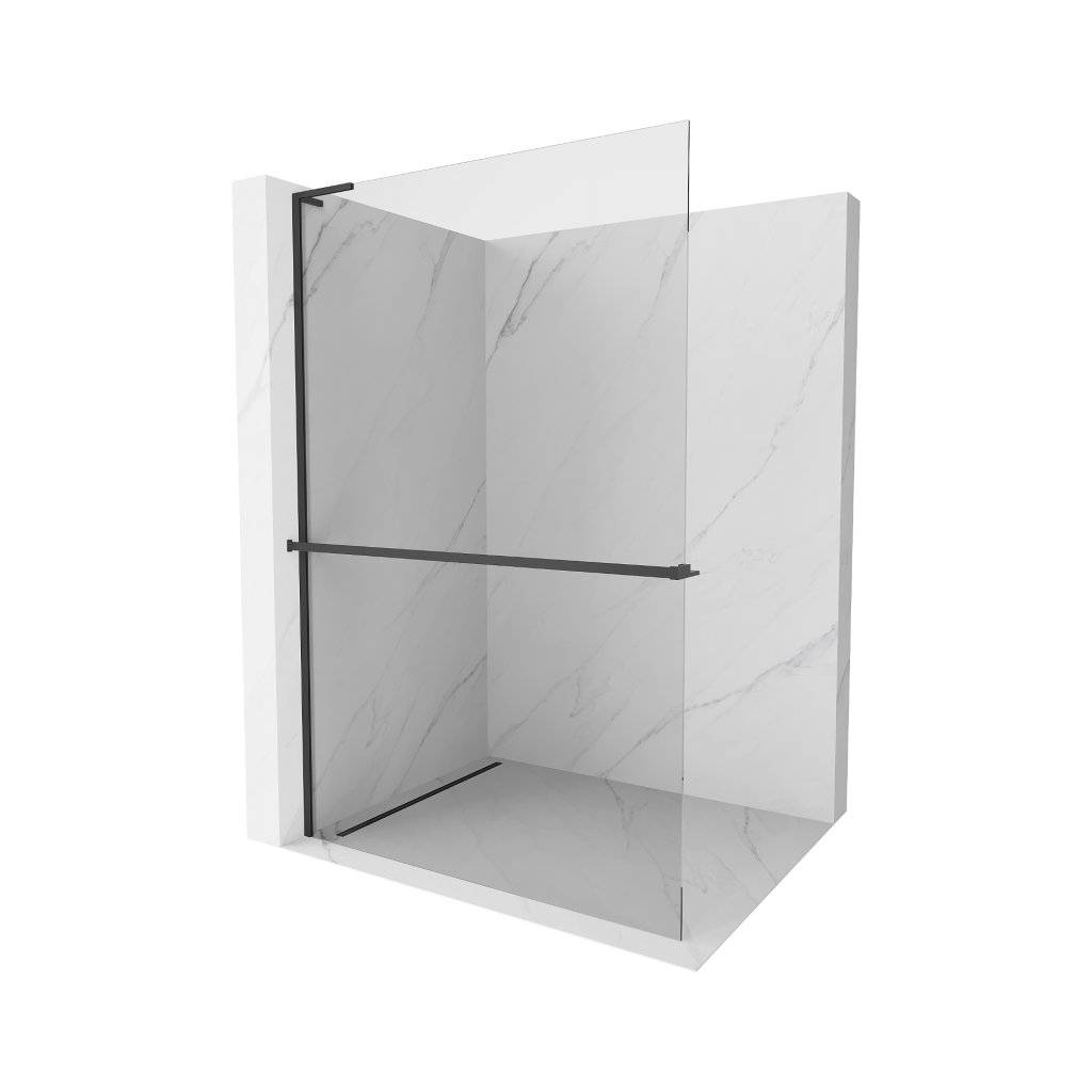 Mexen Kioto+ L, sprchová zástena Walk-In s poličkou a vešiakom 85 x 200 cm, 8mm číre sklo, čierny profil, 800-085-123-70-00
