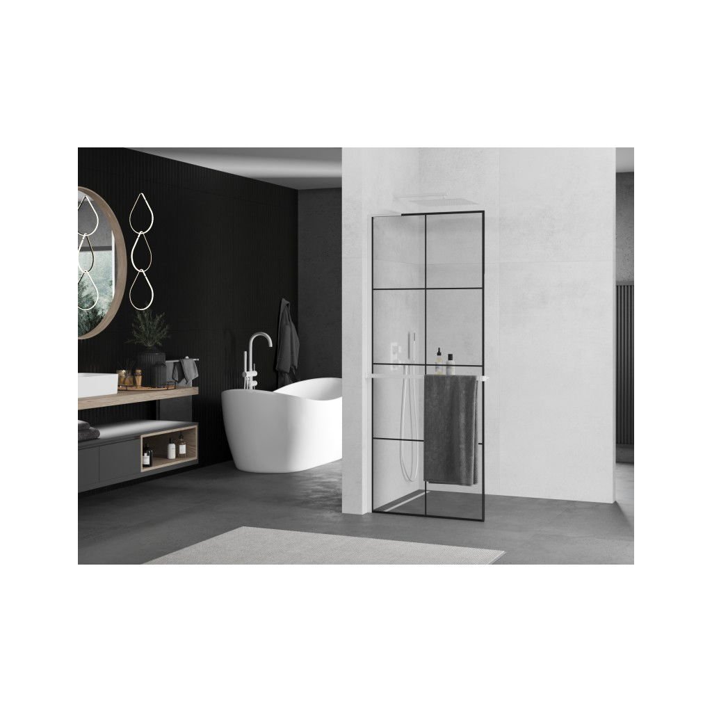 Mexen Kioto+ L, sprchová zástena Walk-In s poličkou a vešiakom 90 x 200 cm, 8mm číre sklo čierny vzor, biely profil, 800-090-123-20-77