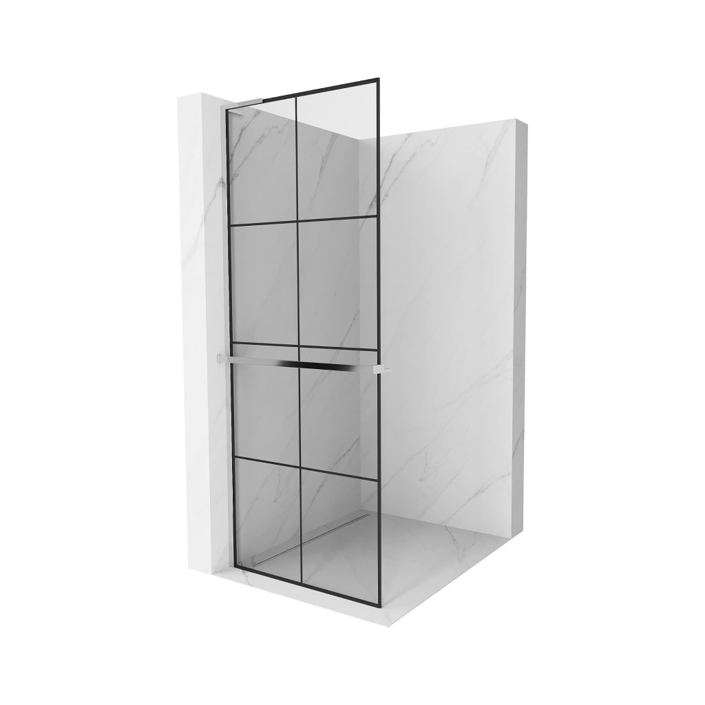 Mexen Kioto+ L, sprchová zástena Walk-In s poličkou a vešiakom 90 x 200 cm, 8mm číre sklo čierny vzor, chrómový profil, 800-090-123-01-77