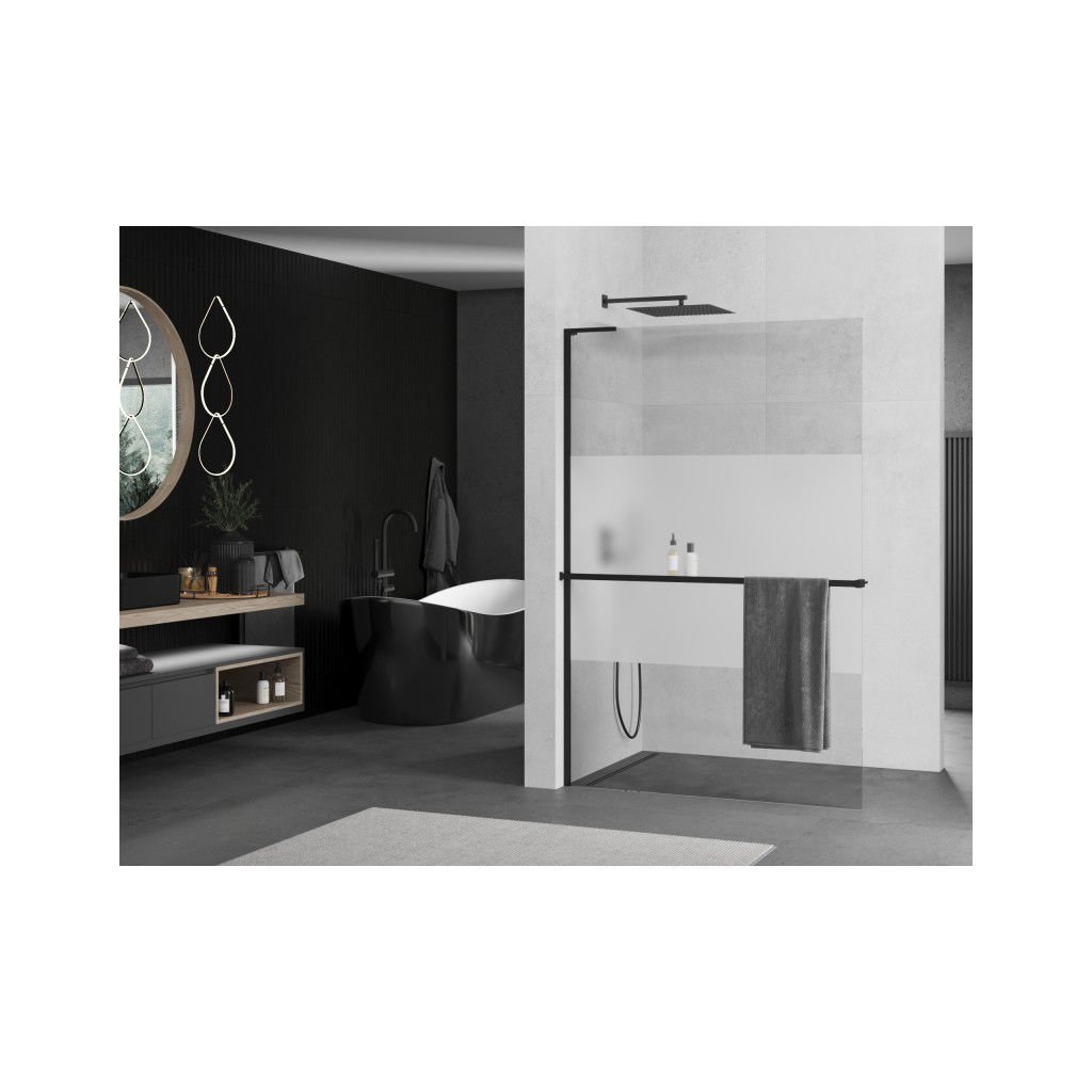 Mexen Kioto+ L, sprchová zástena Walk-In s poličkou a vešiakom 90 x 200 cm, 8mm číre sklo-námraza, čierny profil, 800-090-123-70-30