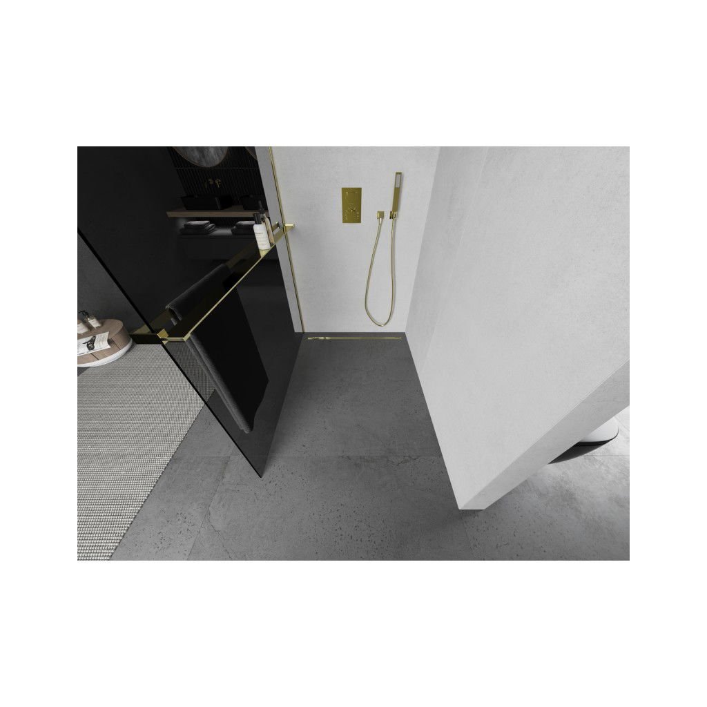 Mexen Kioto+ L, sprchová zástena Walk-In s poličkou a vešiakom 90 x 200 cm, 8mm šedé sklo, zlatý lesklý profil,800-090-123-50-40