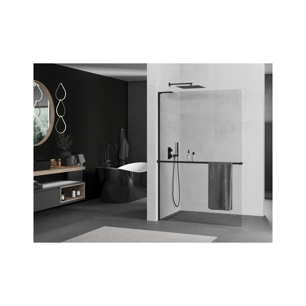 Mexen Kioto+ L, sprchová zástena Walk-In s poličkou a vešiakom 95 x 200 cm, 8mm číre sklo, čierny profil, 800-095-123-70-00