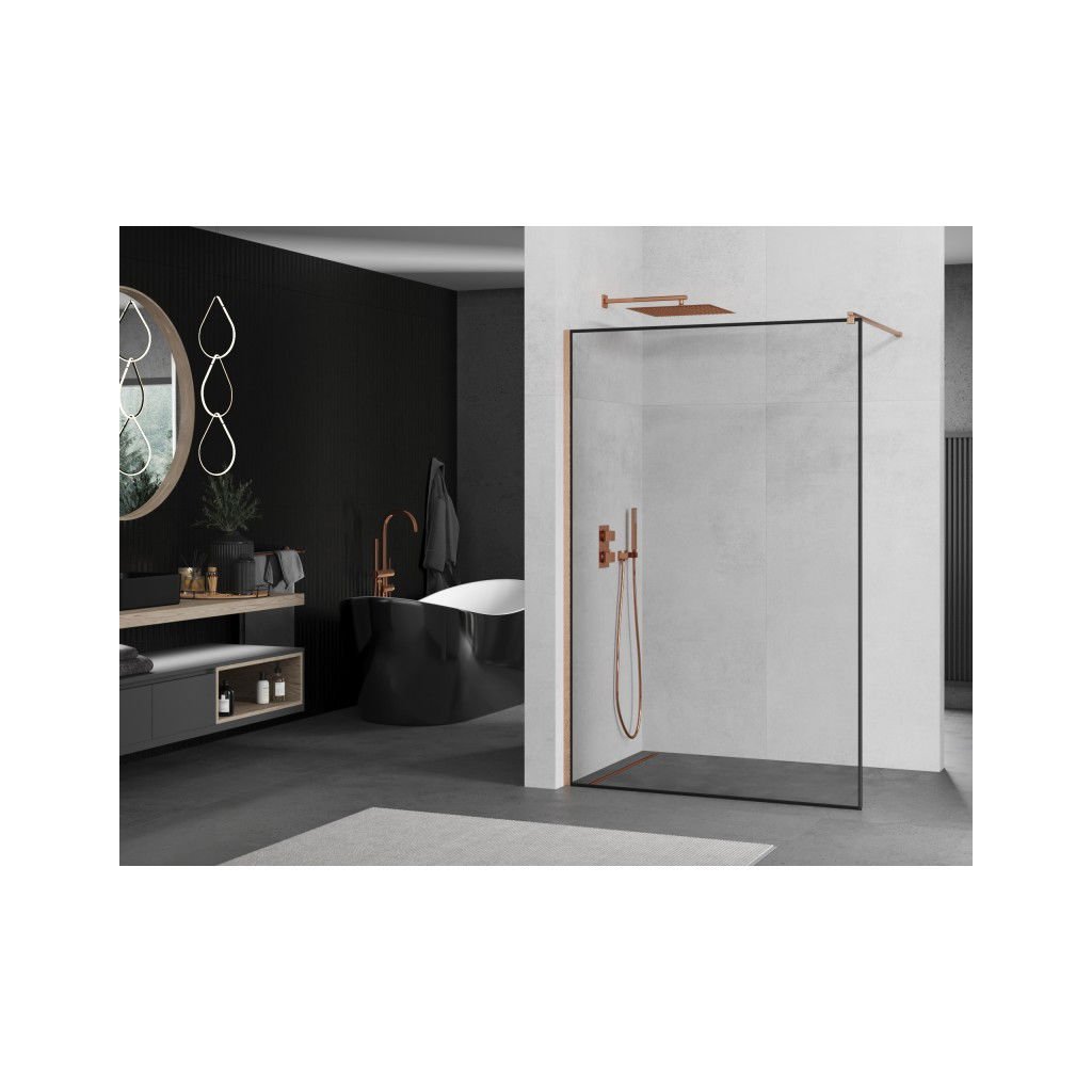 Mexen Kioto, sprchová zástena Walk-In 140 x 200 cm, 8mm číre sklo čierny vzor, medený matný profil, 800-140-101-65-70