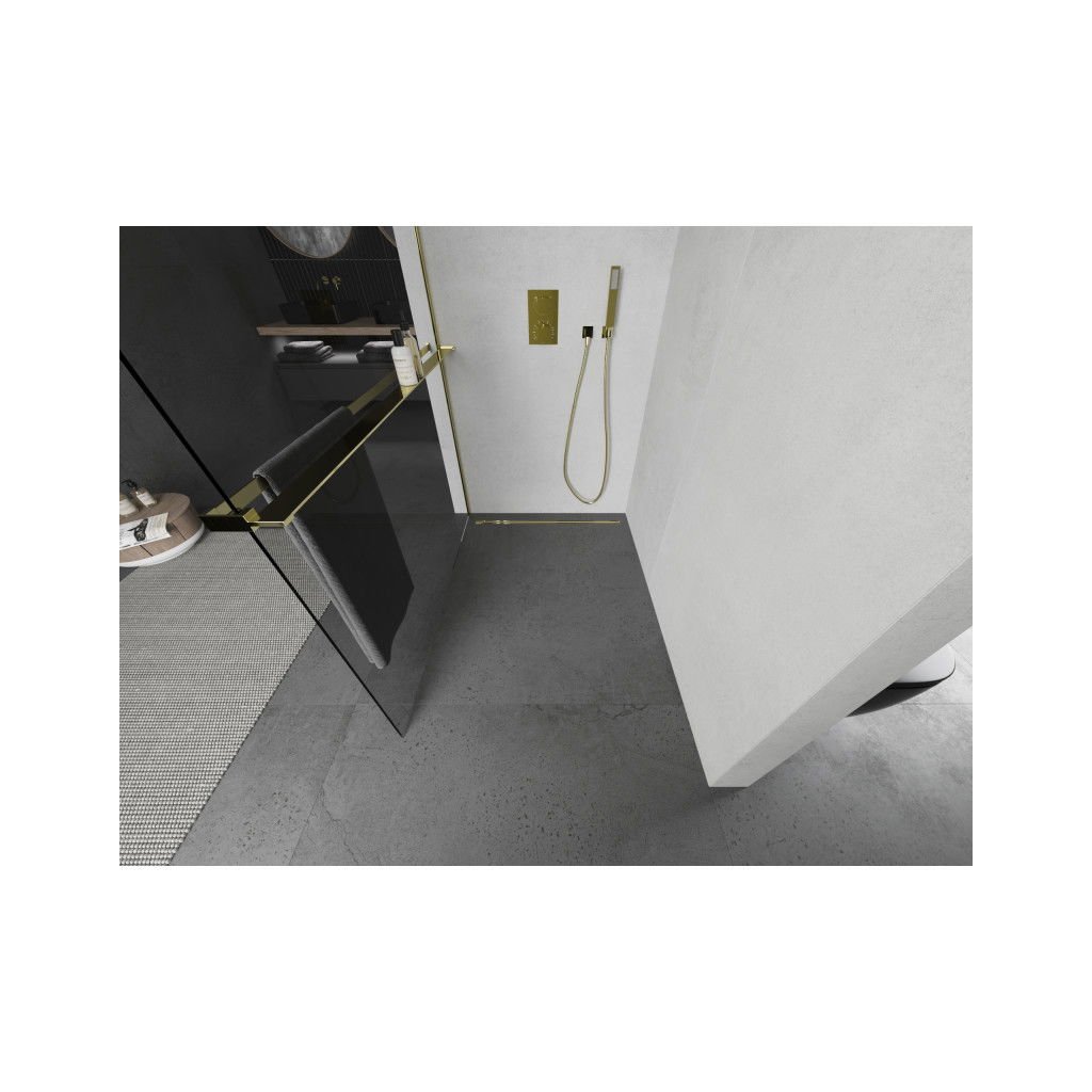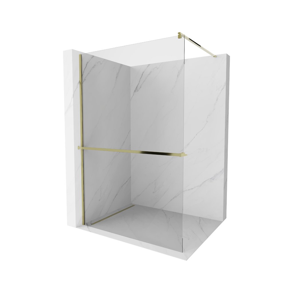 Mexen Kioto, sprchová zástena Walk-In Walk-in 115 x 200 cm, 8mm číre sklo, zlatý lesklý profil + vešiak na uteráky s poličkou, 800-115-121-50-00