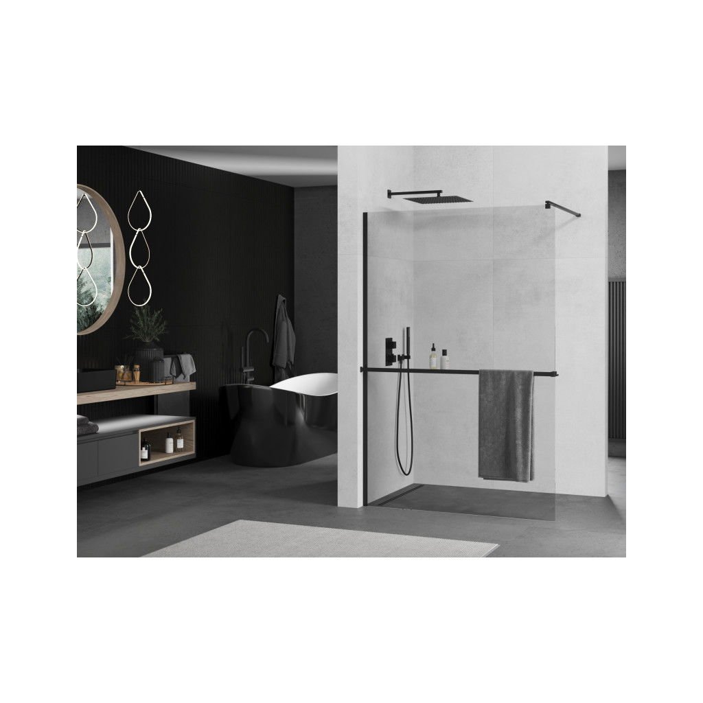 Mexen Kioto, sprchová zástena Walk-In Walk-in 95 x 200 cm, 8mm číre sklo, čierny profil + vešiak na uteráky s poličkou, 800-095-121-70-00