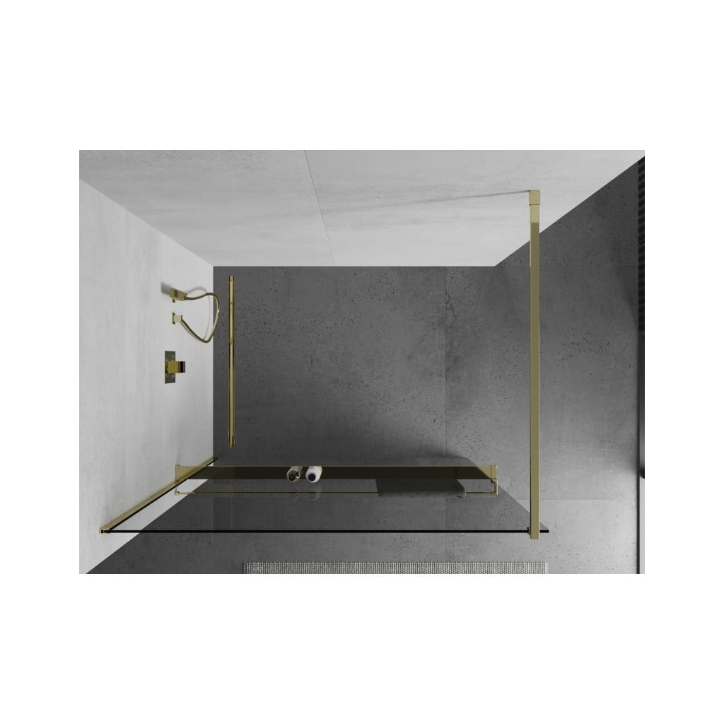 Mexen Kioto+, sprchová zástena s poličkou a držiakom na uteráky 120 x 200 cm, 8mm číre sklo, zlatý profil, 800-120-121-50-00