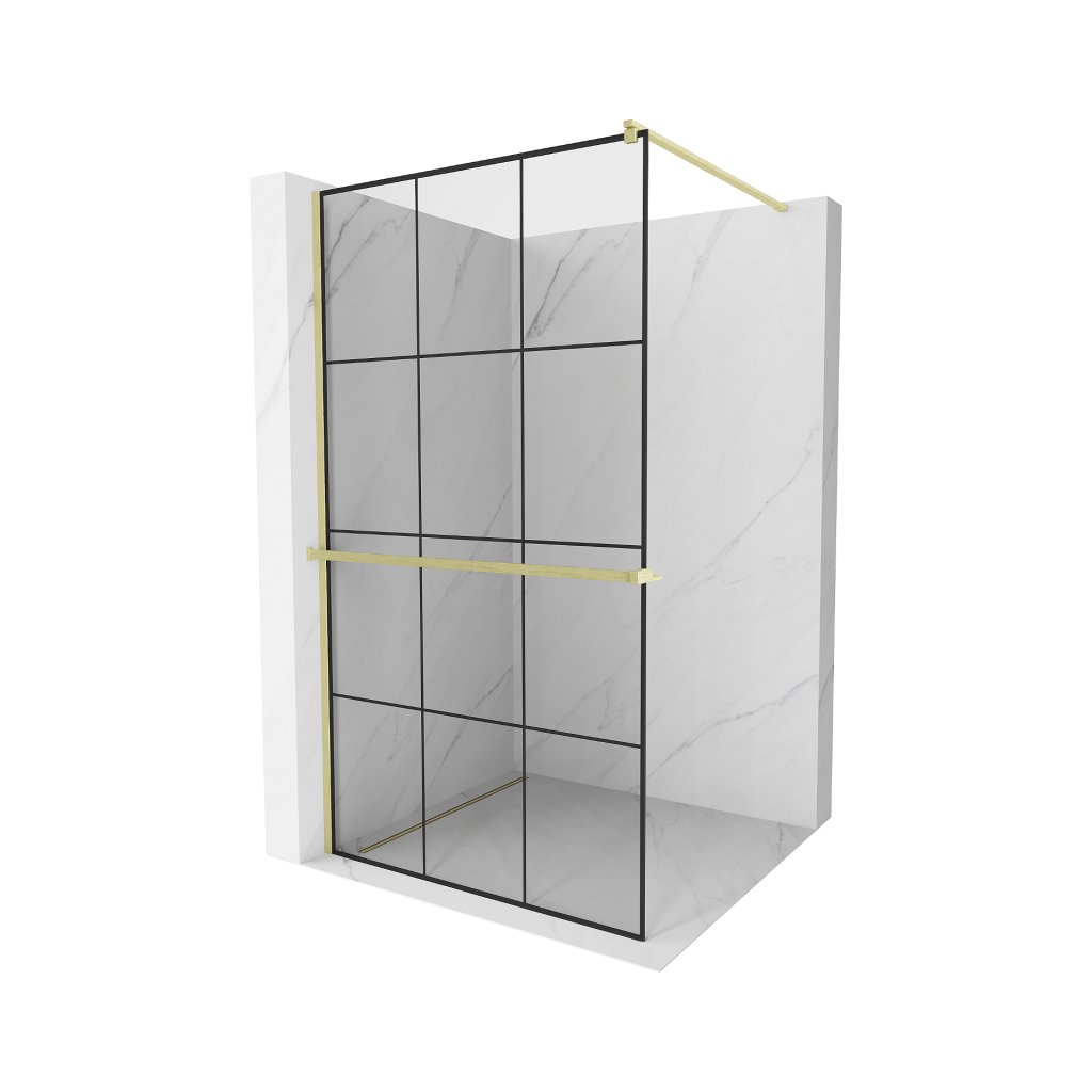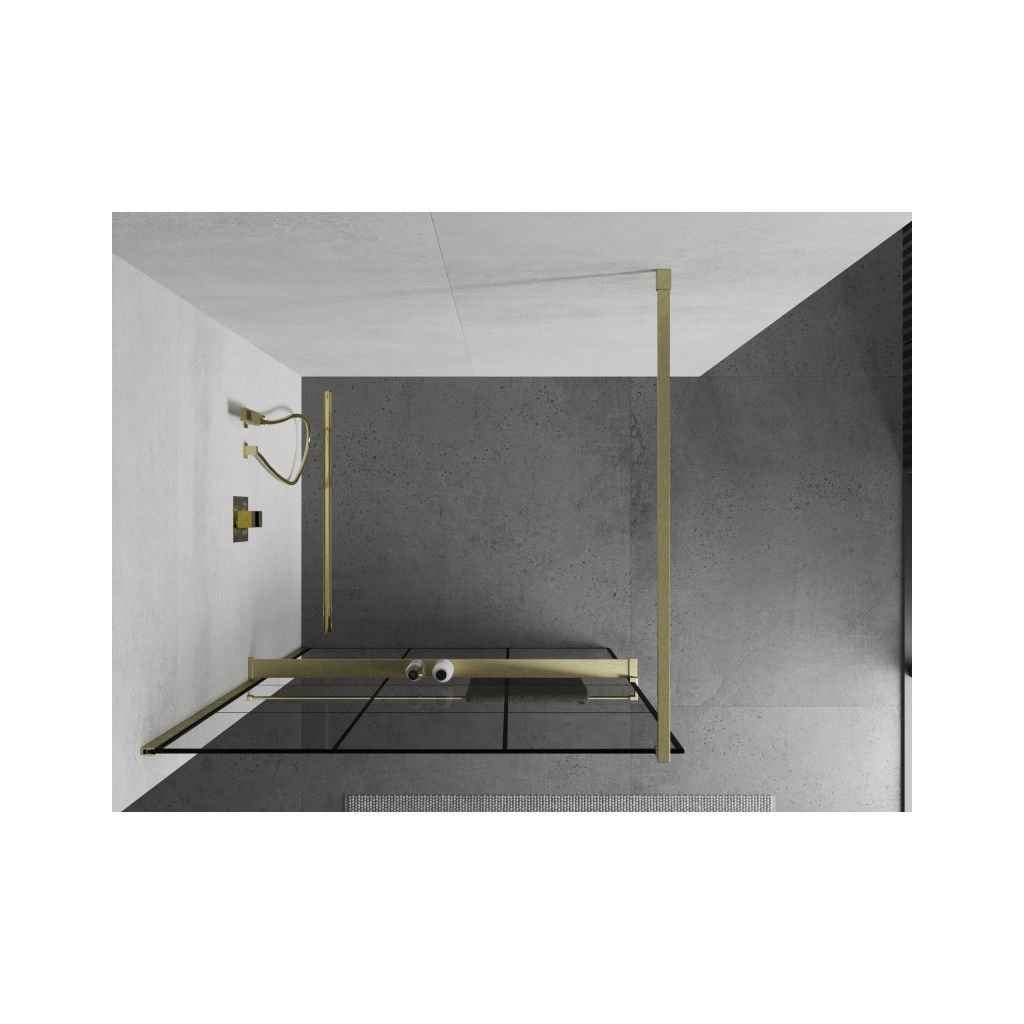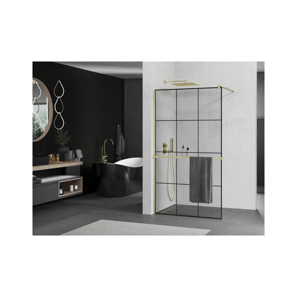 Mexen Kioto+, sprchová zástena Walk-In s poličkou a vešiakom 100 x 200 cm, 8mm číre sklo čierny vzor, zlatý matný profil, 800-100-121-55-77