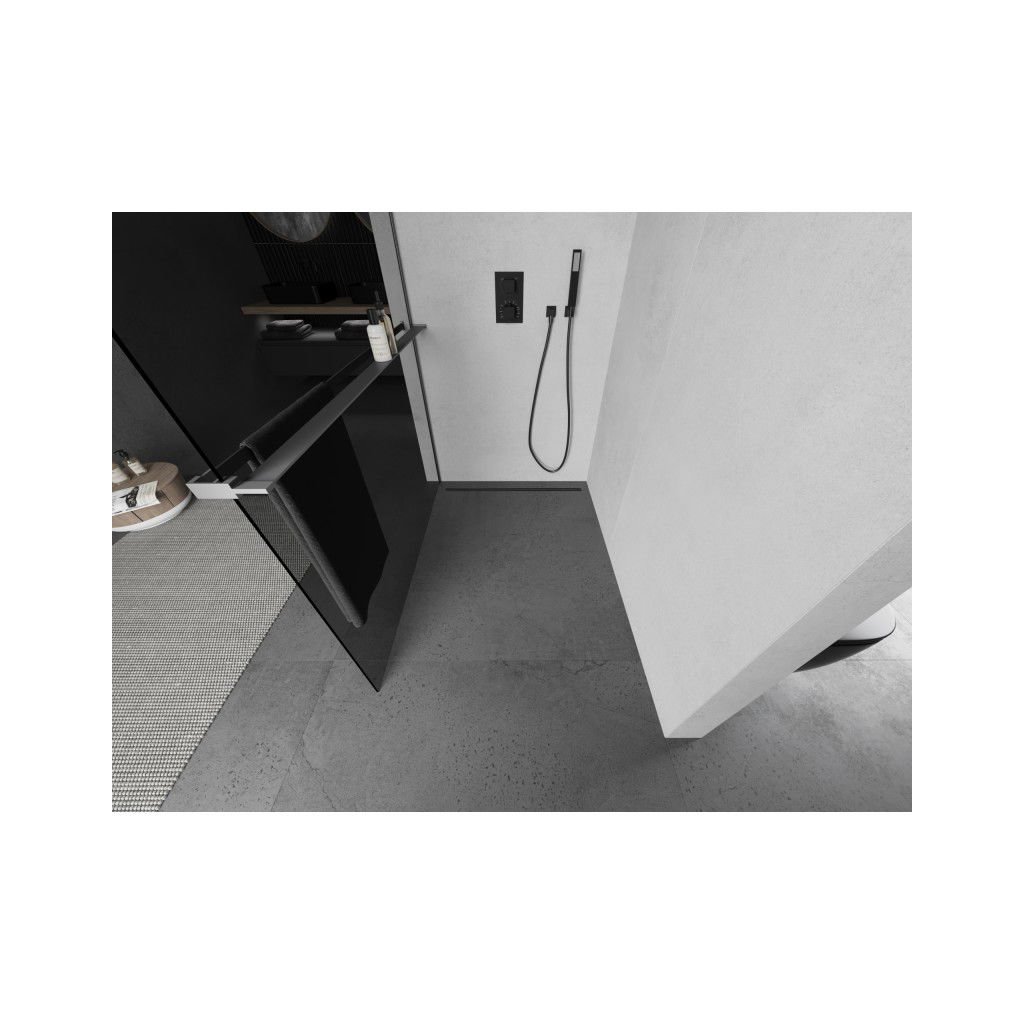 Mexen Kioto+, sprchová zástena Walk-In s poličkou a vešiakom 100 x 200 cm, 8mm šedé sklo, grafitový profil, 800-100-121-95-40