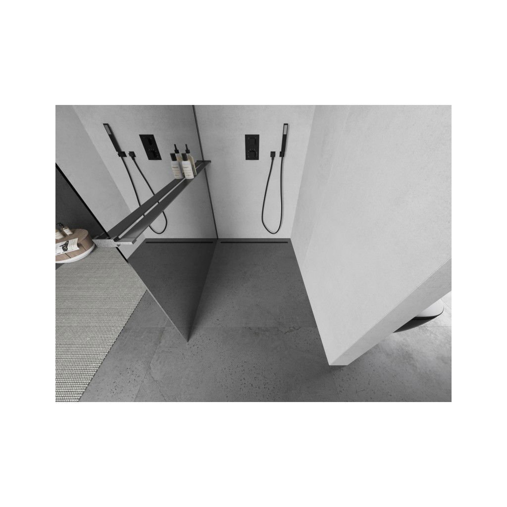 Mexen Kioto+, sprchová zástena Walk-In s poličkou a vešiakom 100 x 200 cm, 8mm sklo vzor zrkadlo, grafitový profil, 800-100-121-66-50