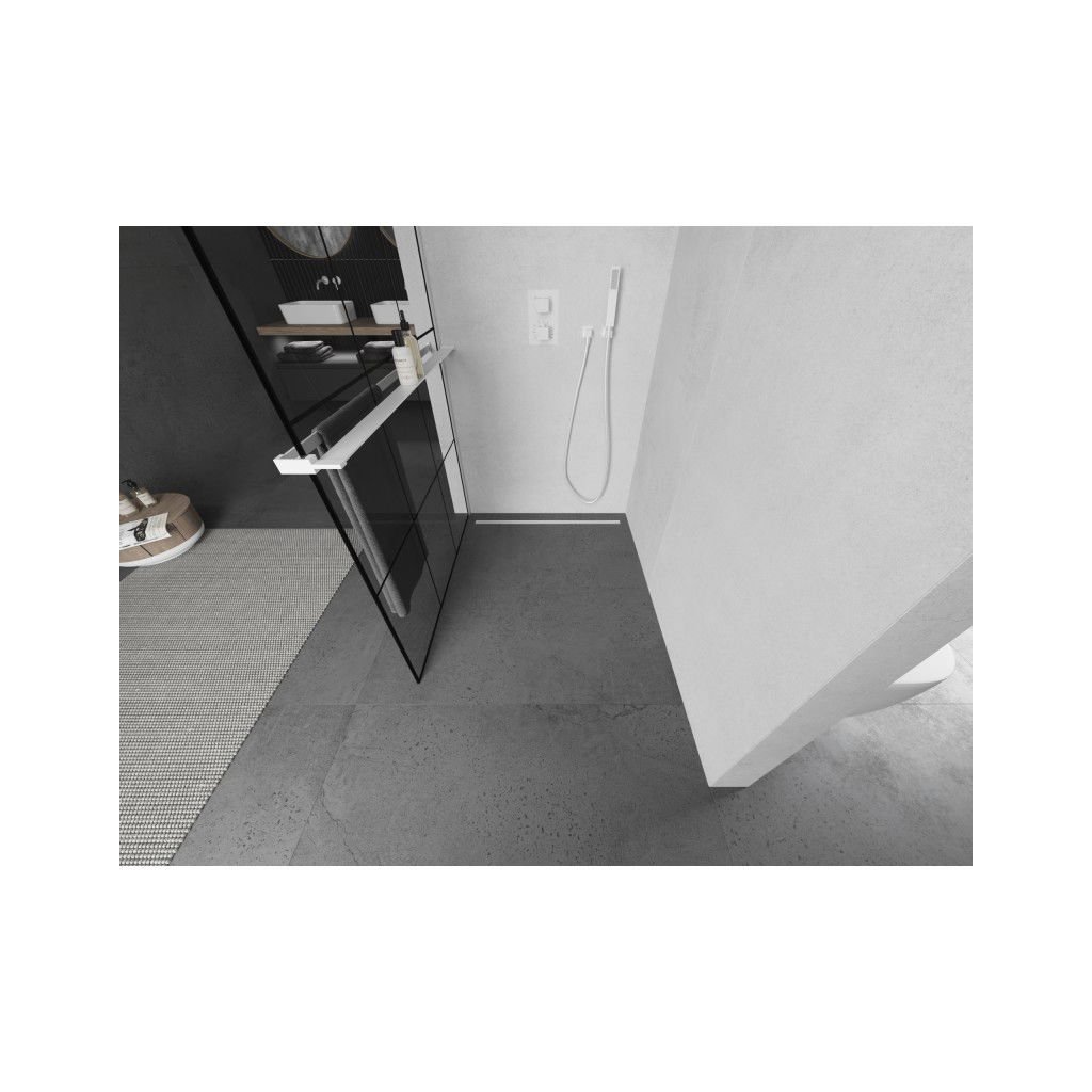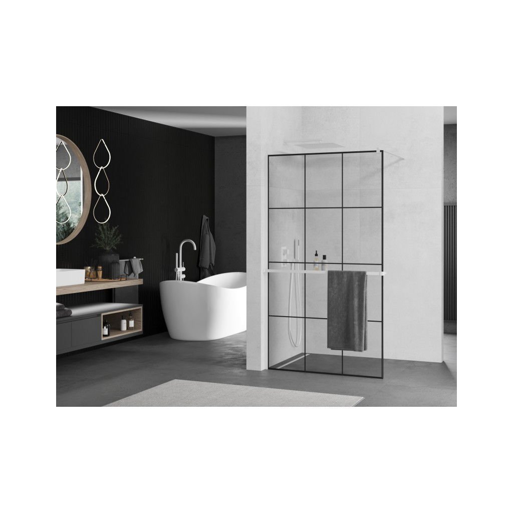 Mexen Kioto+, sprchová zástena Walk-In s poličkou a vešiakom 110 x 200 cm, 8mm číre sklo čierny vzor, biely profil, 800-110-121-20-77