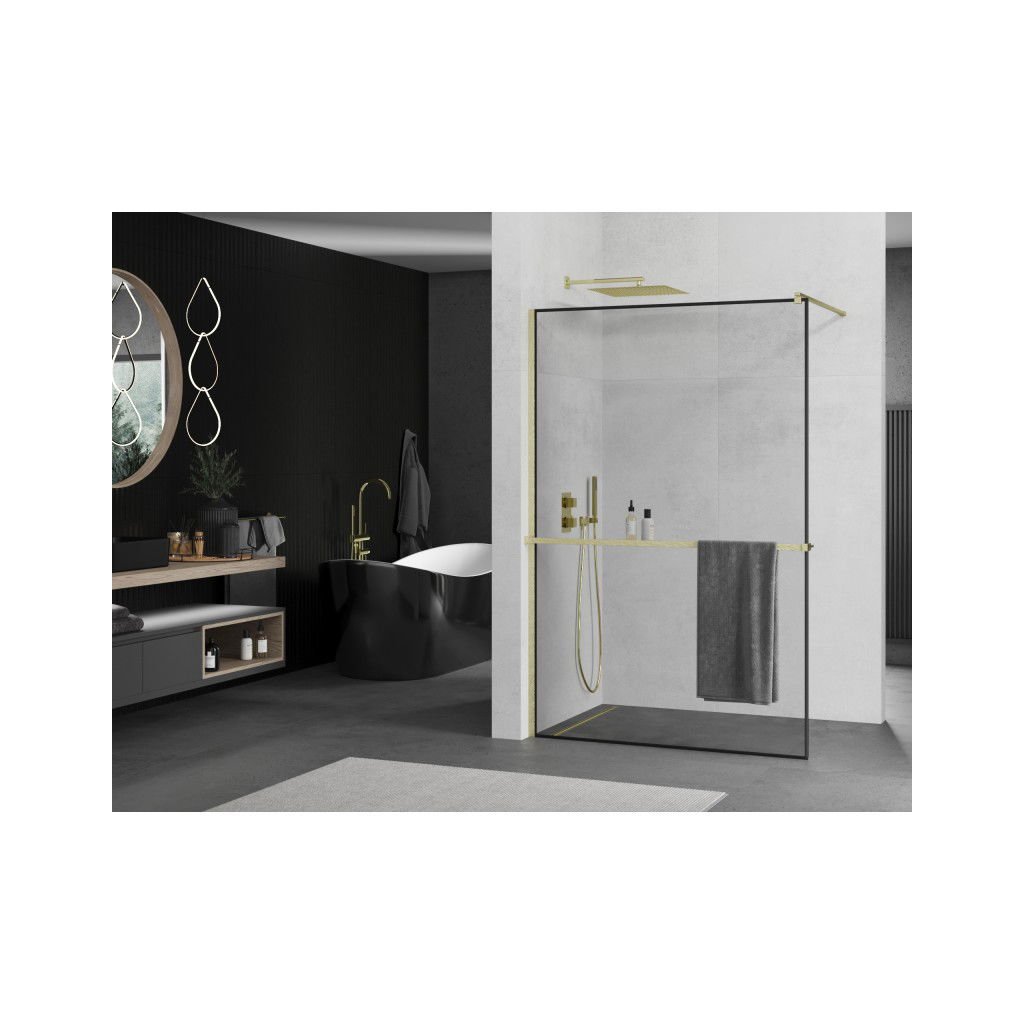 Mexen Kioto+, sprchová zástena Walk-In s poličkou a vešiakom 130 x 200 cm, 8mm číre sklo čierny vzor, zlatý matný profil, 800-130-121-55-70