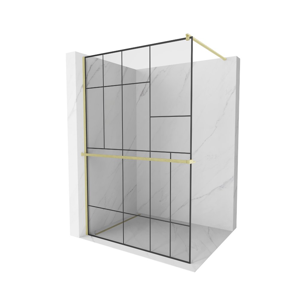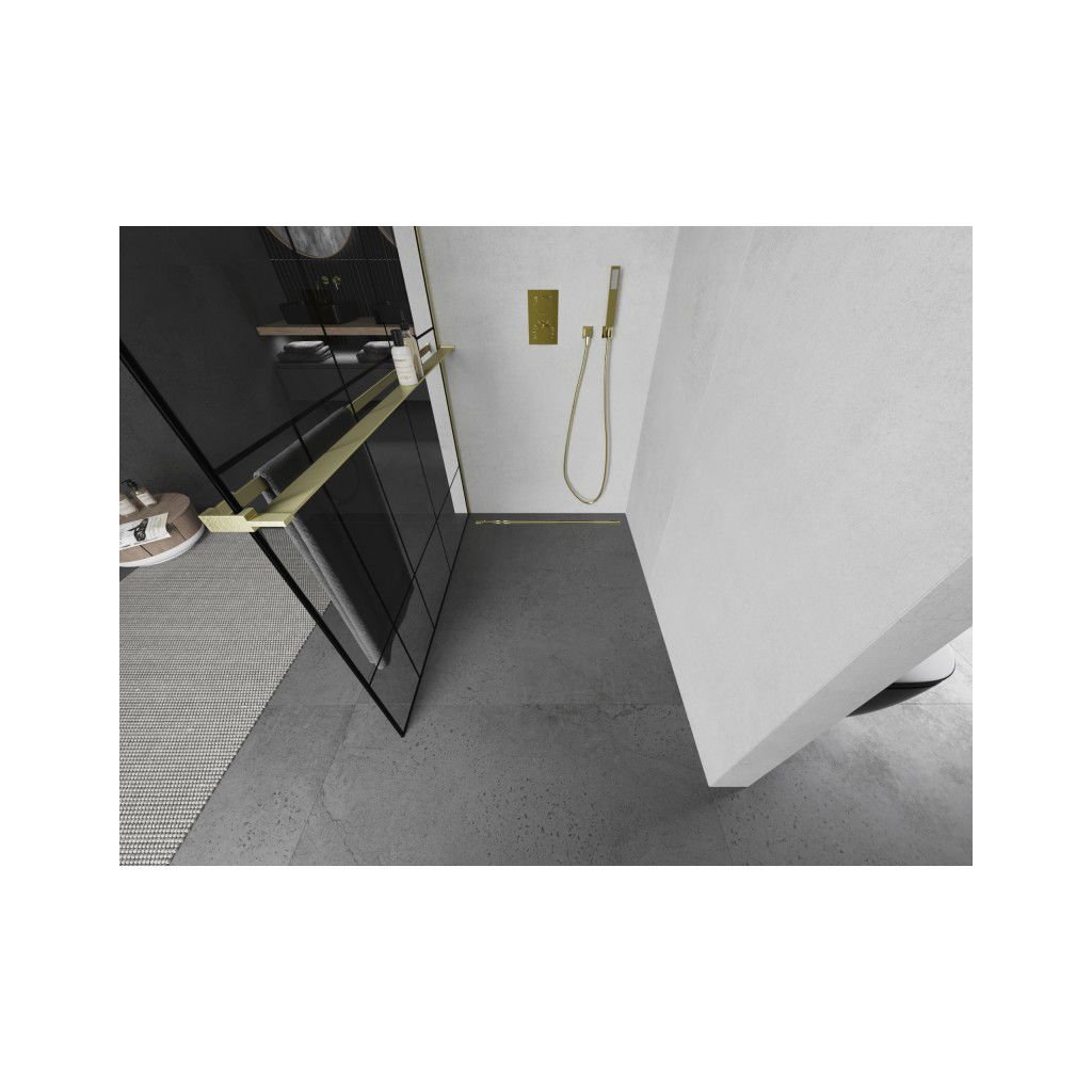 Mexen Kioto+, sprchová zástena Walk-In s poličkou a vešiakom 130 x 200 cm, 8mm číre sklo čierny vzor, zlatý matný profil, 800-130-121-55-78