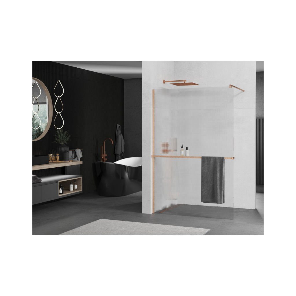Mexen Kioto+, sprchová zástena Walk-In s poličkou a vešiakom 130 x 200 cm, 8mm sklo s rebrovým vzorom, medený matný profil, 800-130-121-65-09