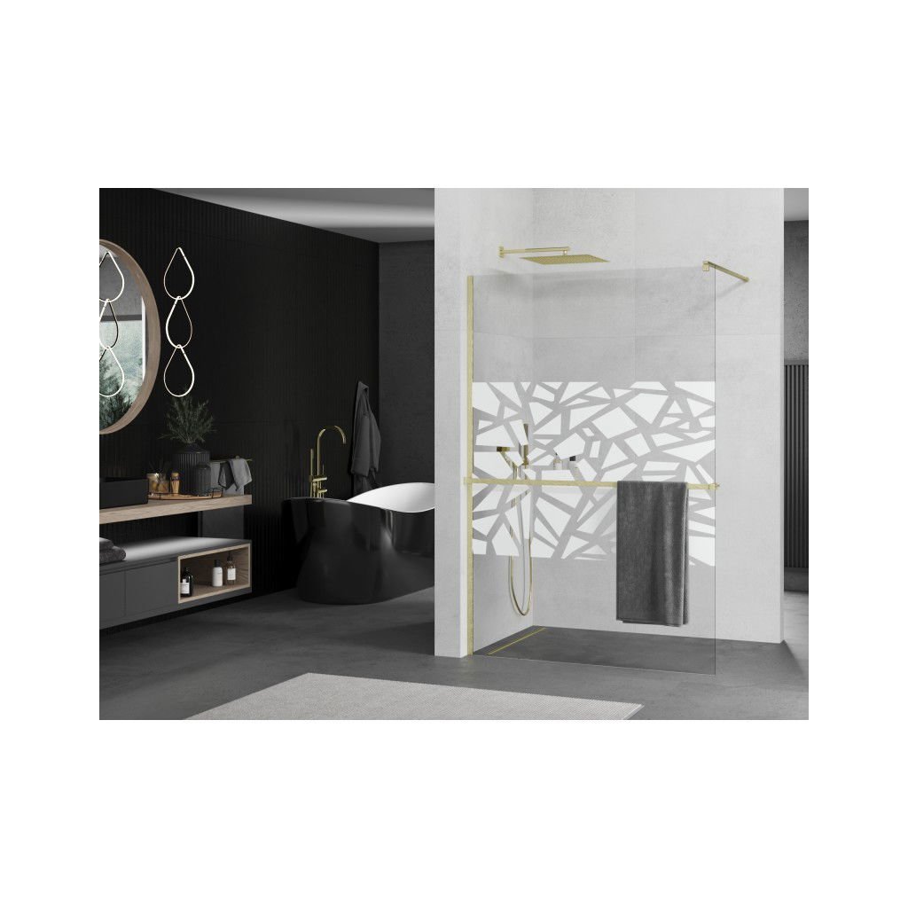 Mexen Kioto+, sprchová zástena Walk-In s poličkou a vešiakom 140 x 200 cm, 8mm číre sklo biely vzor, zlatý matný profil, 800-140-121-55-85