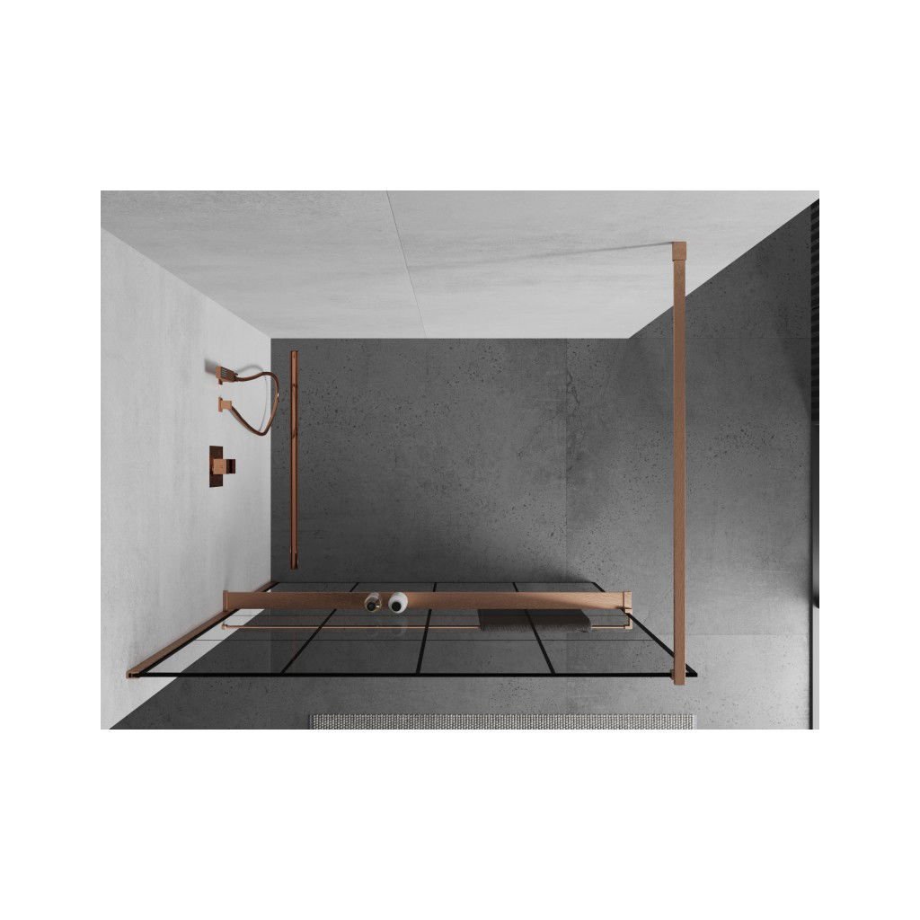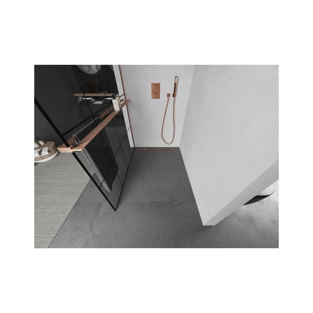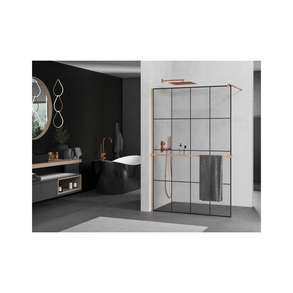 Mexen Kioto+, sprchová zástena Walk-In s poličkou a vešiakom 140 x 200 cm, 8mm číre sklo čierny vzor, medený matný profil, 800-140-121-65-77