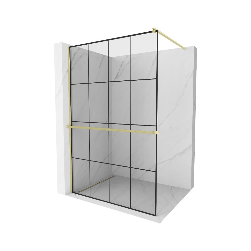 Mexen Kioto+, sprchová zástena Walk-In s poličkou a vešiakom 140 x 200 cm, 8mm číre sklo čierny vzor, zlatý matný profil, 800-140-121-55-77