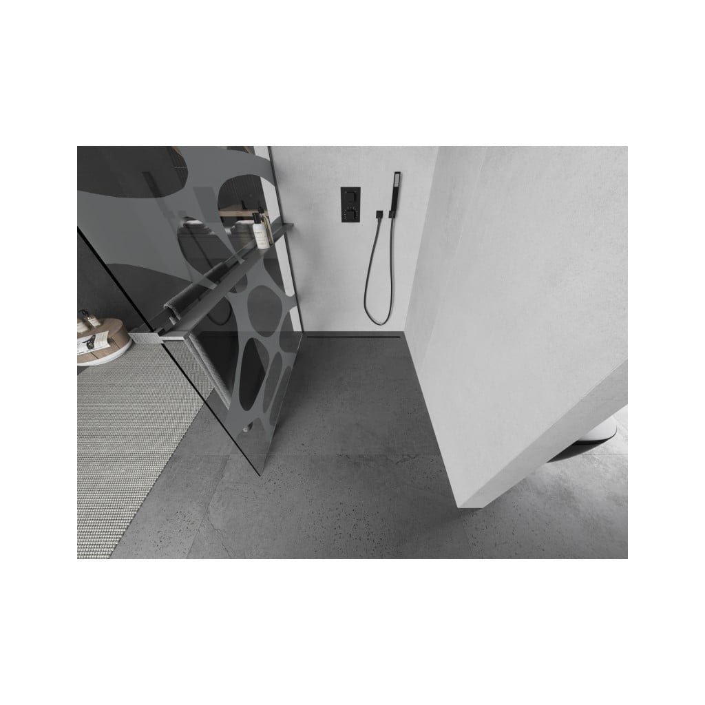 Mexen Kioto+, sprchová zástena Walk-In s poličkou a vešiakom 70 x 200 cm, 8mm číre sklo biely vzor, grafitový profil, 800-070-121-66-97
