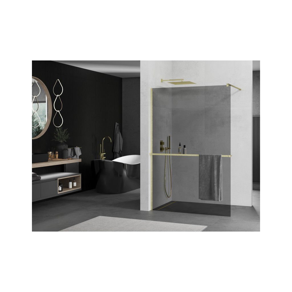 Mexen Kioto+, sprchová zástena Walk-In s poličkou a vešiakom 70 x 200 cm, 8mm šedé sklo, zlatý matný profil, 800-070-121-55-40
