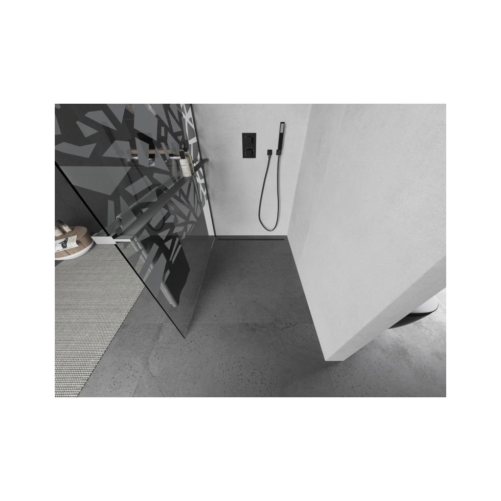 Mexen Kioto+, sprchová zástena Walk-In s poličkou a vešiakom 80 x 200 cm, 8mm číre sklo biely vzor, grafitový profil, 800-080-121-95-85