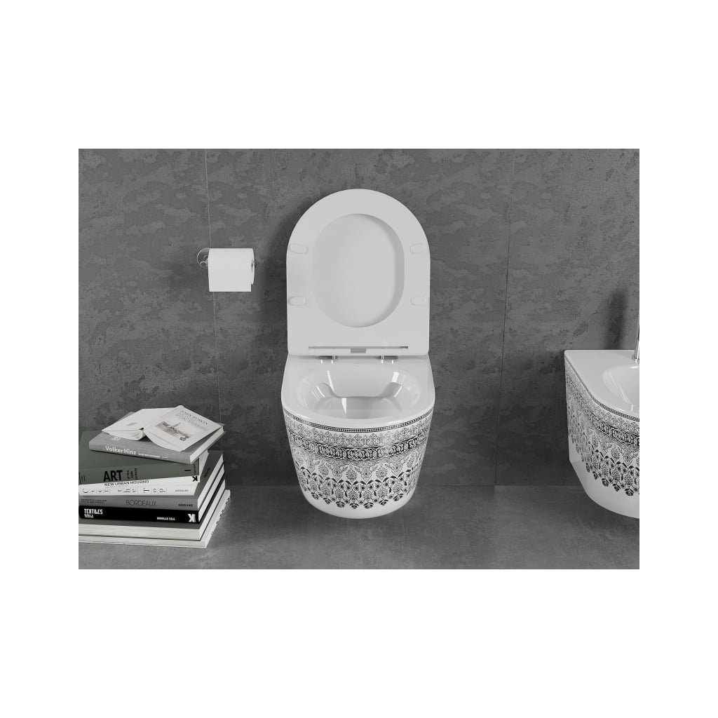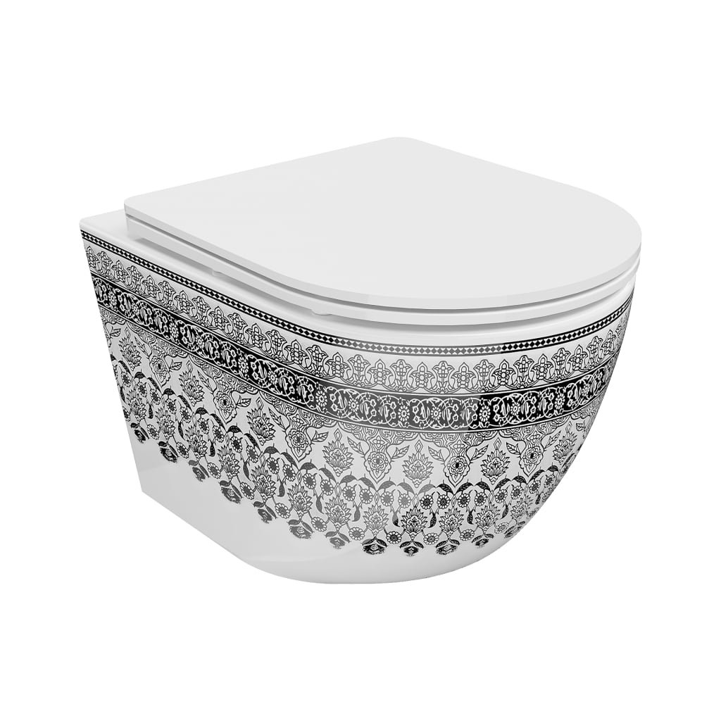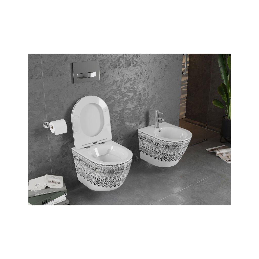 Mexen Lena, závesná WC misa Rimless s duroplastovým sedátkom s pomalým zatváraním, biela-čierny vzor, 30224095