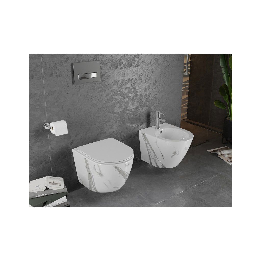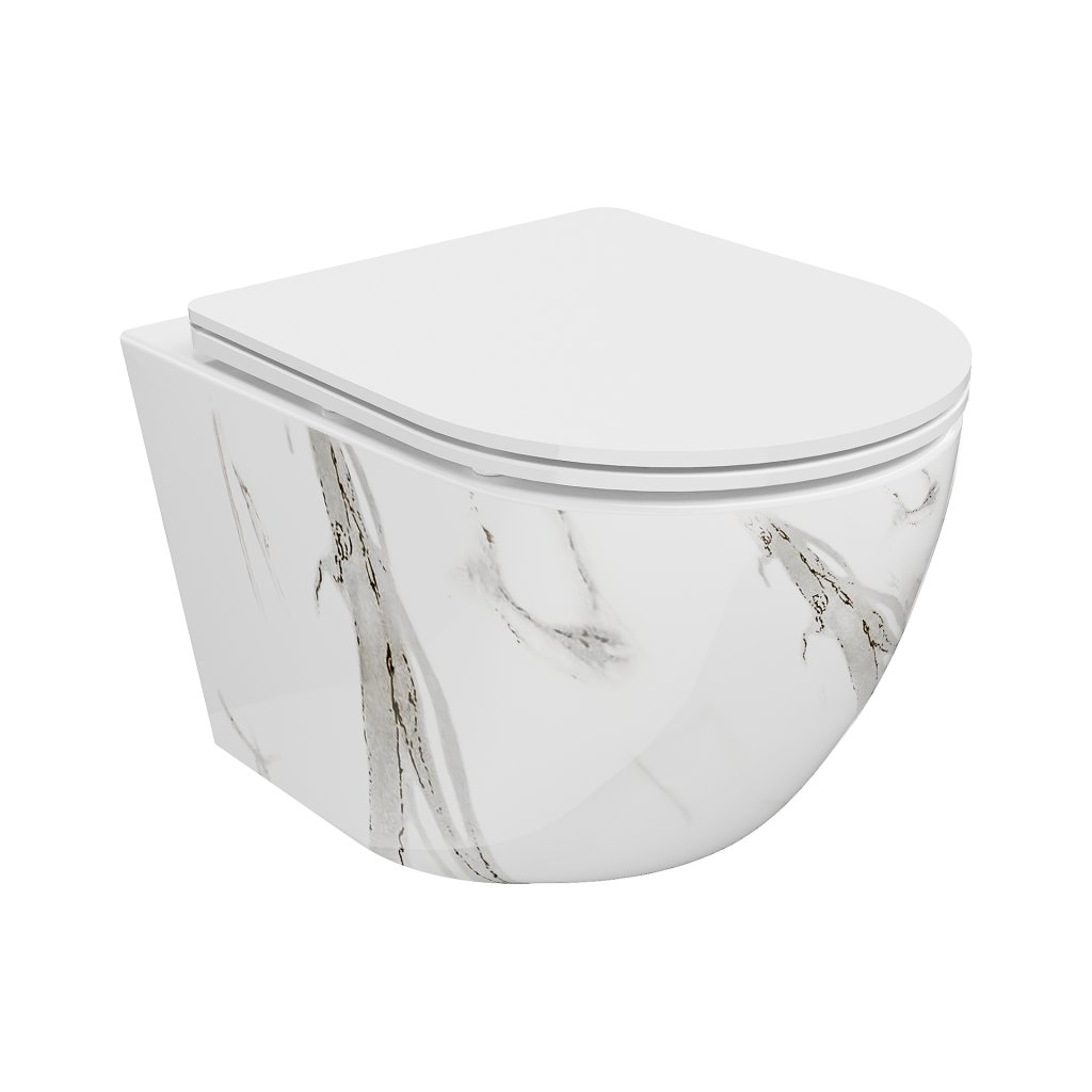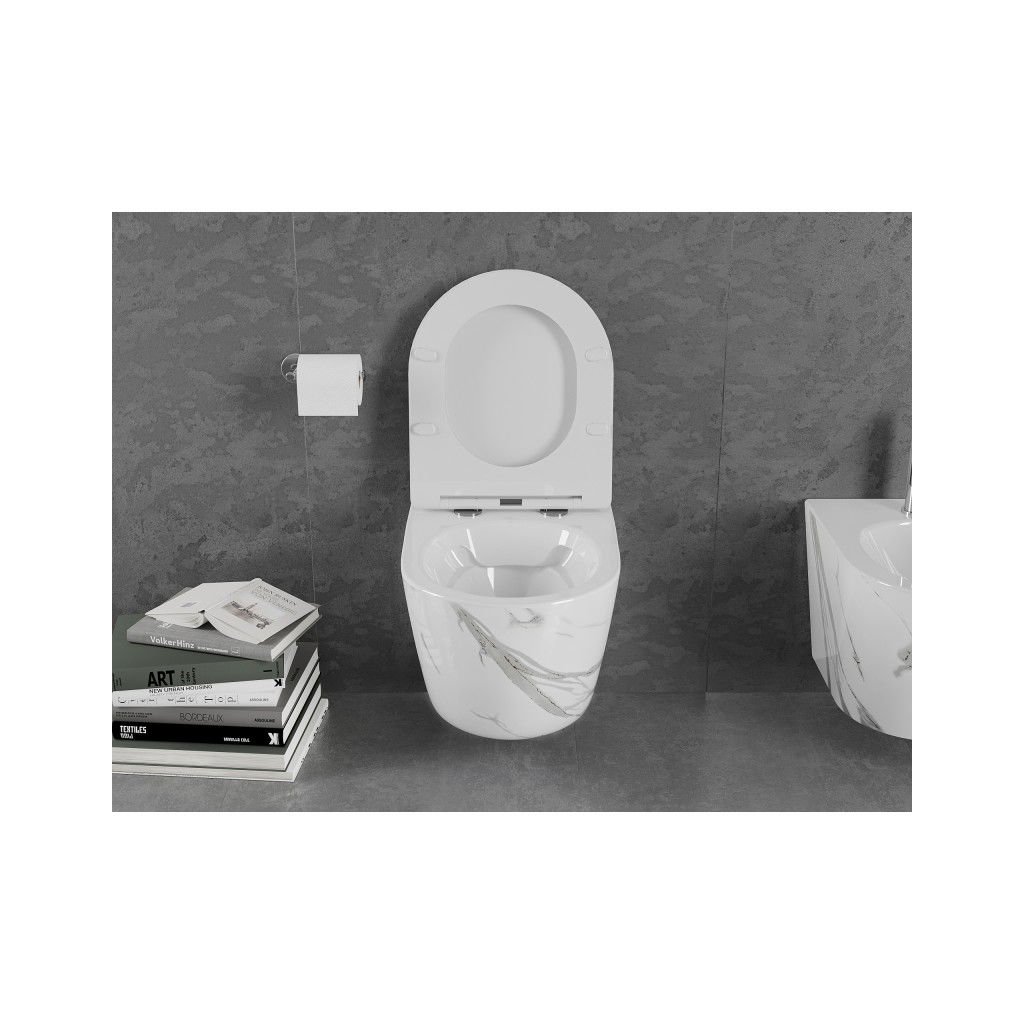 Mexen Lena, závesná WC misa Rimless s duroplastovým sedátkom s pomalým zatváraním, imitácia mramoru-biely kameň, 30224094