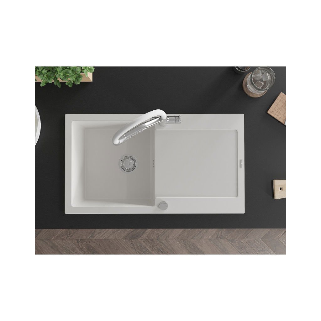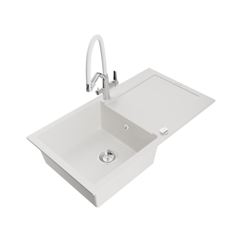 Mexen Leo, 1-komorový granitový drez 900x500x190 mm a drezová batéria Duo, biela, 6501-20-671701-02