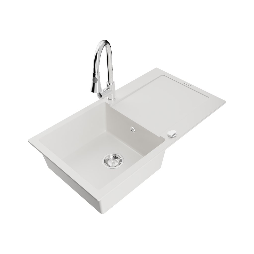 Mexen Leo, 1-komorový granitový drez 900x500x190 mm a drezová batéria Elia, biela, 6501-20-670101-00