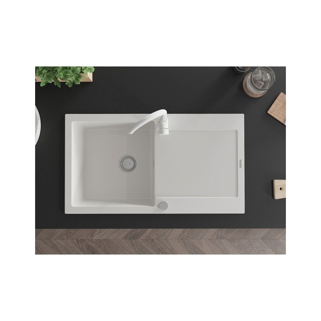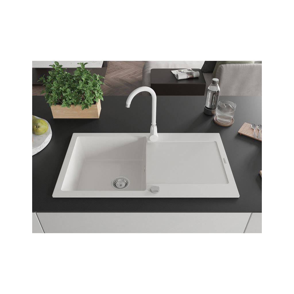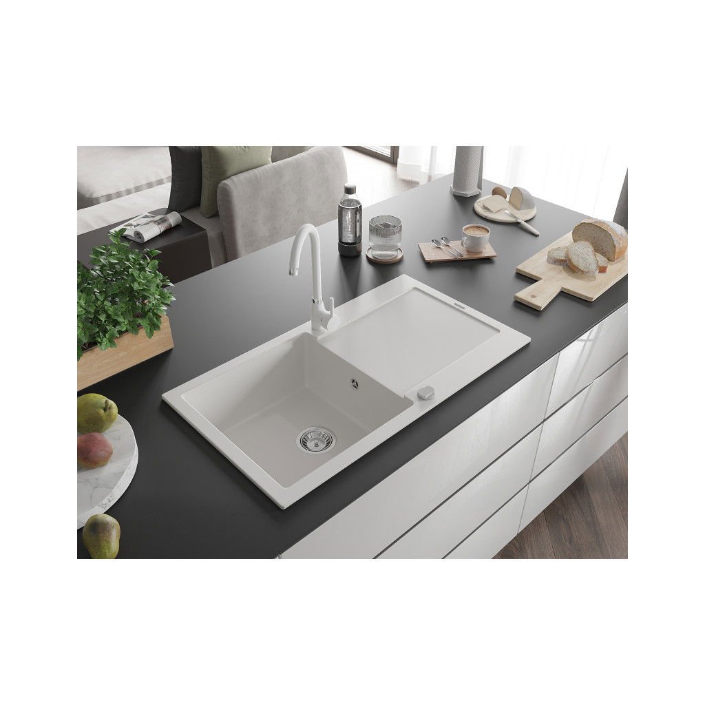 Mexen Leo, 1-komorový granitový drez s odkvapkávačom 90x50 cm a kuchynskou batériou Telma, biela, 6501-20-670200-20
