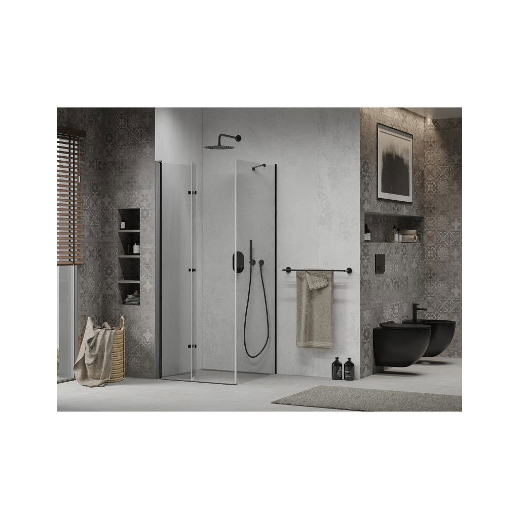 Skvelá voľba do každej kúpeľne. Elegantný sprchový kút je vyrobený z 6 mm hrubého tvrdeného skla v čírom prevedení. Aplikovaná povrchová úprava skla zaisťuje maximálny komfort všetkým užívateľom. Táto technológia zaručuje jedinečné vlastnosti zabraňujúce znečisteniu skla - povrch stačí iba opláchnuť vodou. Kút je uchytený v čiernych hliníkových profiloch a je vybavený tesnením zabraňujúcim úniku vody mimo sprchovací kút. Dvere sprchovacieho kúta sú skladacie (dve sklá spojené kvalitnými pántmi s možnosťou zloženia dovnútra aj von). Na otváranie slúži decentná kovová rukoväť.