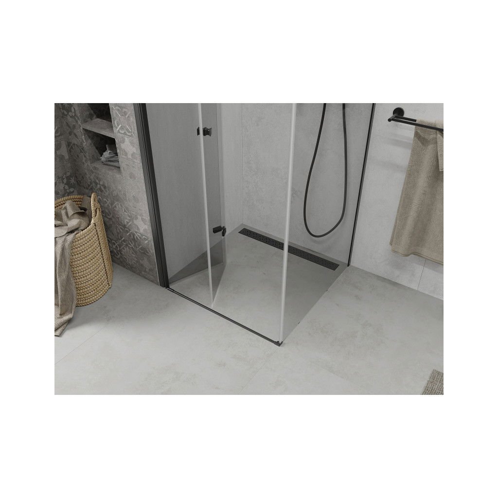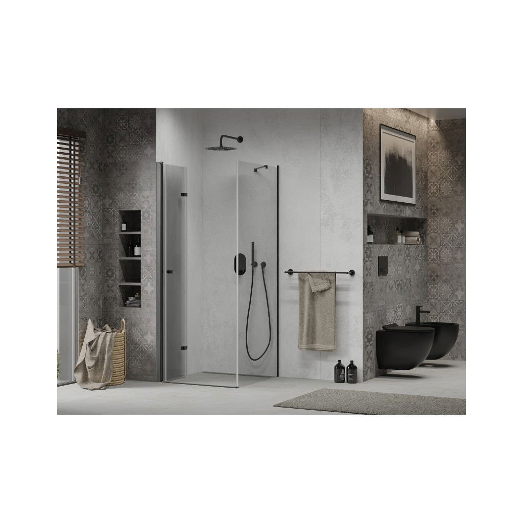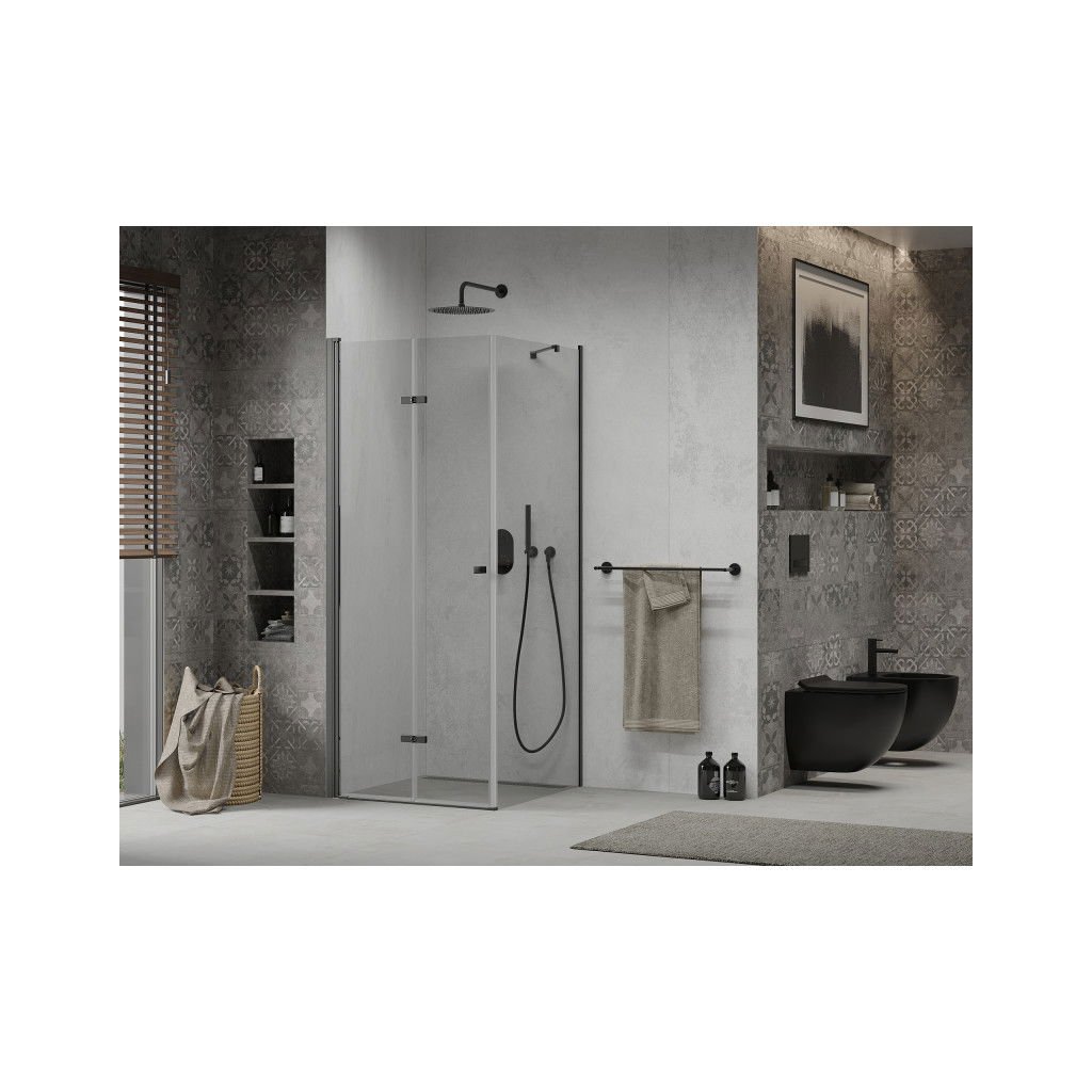 Skvelá voľba do každej kúpeľne. Elegantný sprchový kút je vyrobený z 6 mm hrubého tvrdeného skla v čírom prevedení. Aplikovaná povrchová úprava skla zaisťuje maximálny komfort všetkým užívateľom. Táto technológia zaručuje jedinečné vlastnosti zabraňujúce znečisteniu skla - povrch stačí iba opláchnuť vodou. Kút je uchytený v čiernych hliníkových profiloch a je vybavený tesnením zabraňujúcim úniku vody mimo sprchovací kút. Dvere sprchovacieho kúta sú skladacie (dve sklá spojené kvalitnými pántmi s možnosťou zloženia dovnútra aj von). Na otváranie slúži decentná kovová rukoväť.