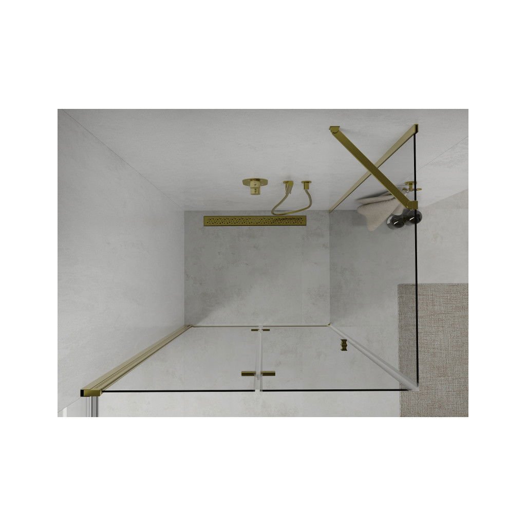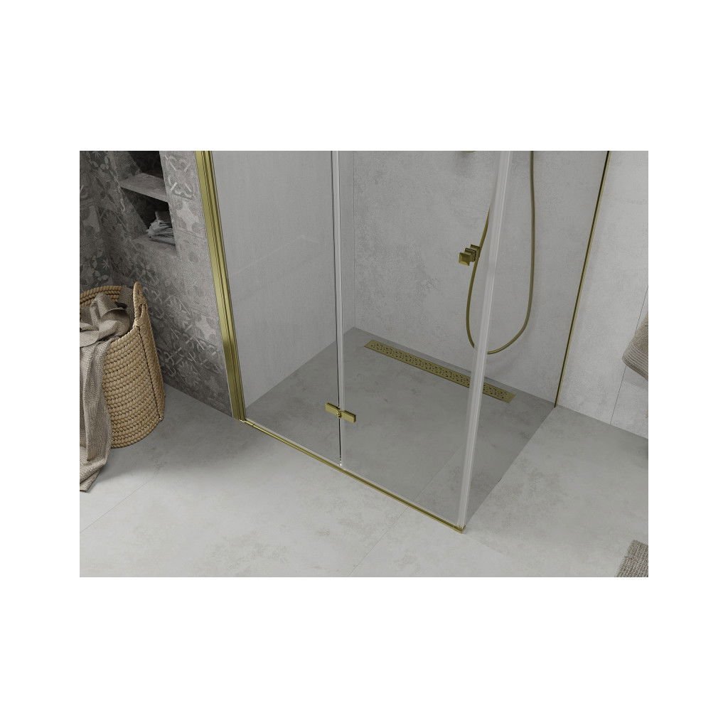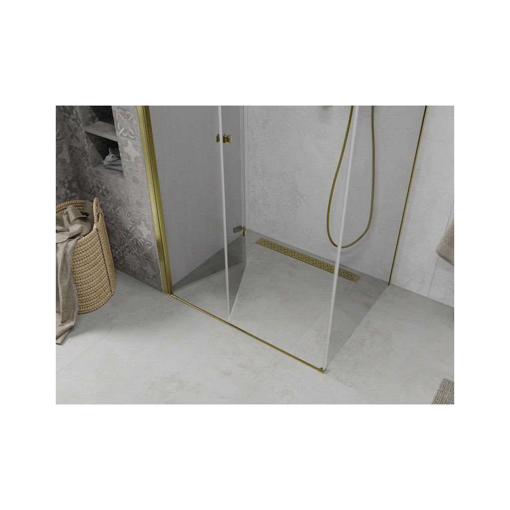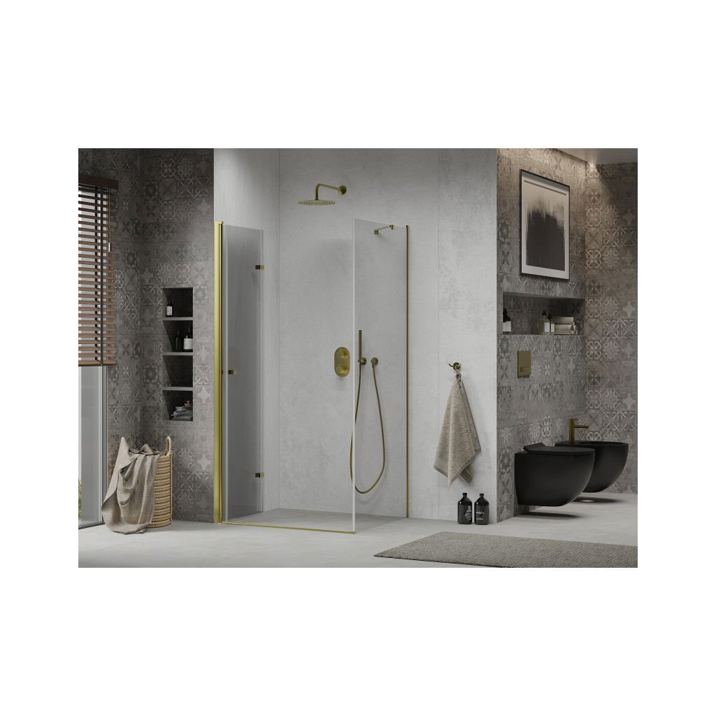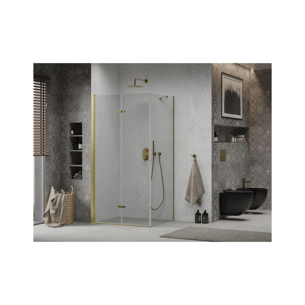 Skvelá voľba do každej kúpeľne. Elegantný sprchový kút je vyrobený zo 6 mm hrubého tvrdeného skla v čírom prevedení. Aplikovaná povrchová úprava skla zaisťuje maximálny komfort všetkým užívateľom. Táto technológia zaručuje jedinečné vlastnosti zabraňujúce znečisteniu skla - povrch stačí iba opláchnuť vodou. Kút je uchytený v zlatých hliníkových profiloch a je vybavený tesnením zabraňujúcim úniku vody mimo sprchovací kút. Dvere sprchovacieho kúta sú skladacie (dve sklá spojené kvalitnými pántami s možnosťou zloženia dovnútra aj von). Na otváranie slúži decentná kovová rukoväť.