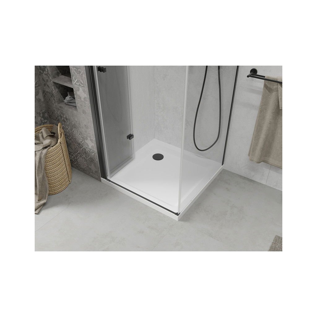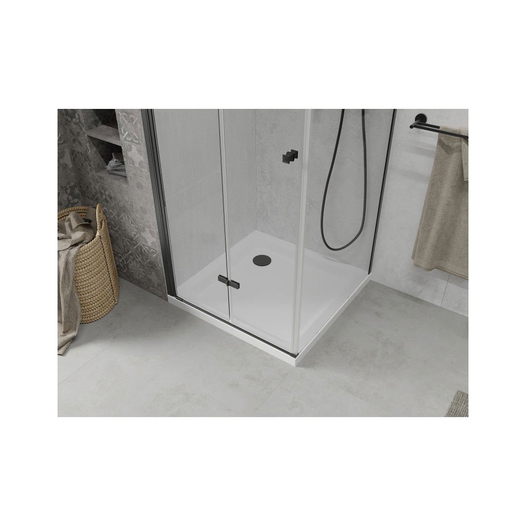 Mexen Lima, sprchovací kút so skladacími dverami 70 (dvere) x 70 (stena) cm, 6mm číre sklo, čierny profil + slim sprchová vanička biela s čiernym sifónom, 856-070-070-70-00-4010B