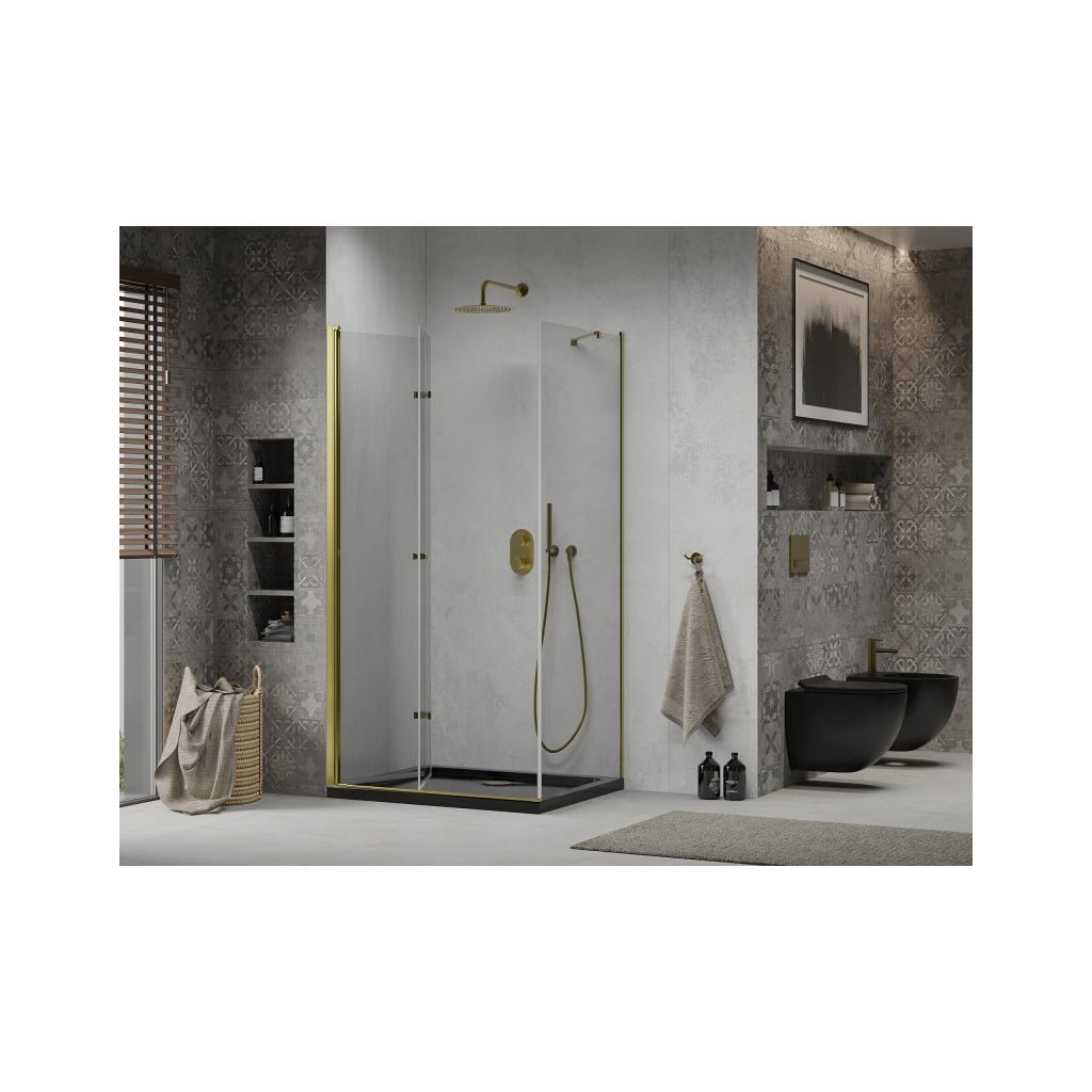 Mexen Lima, sprchový kút so skladacími dverami 100 (dvere) x 80 (stena) cm, 6mm číre sklo, chrómový profil + slim sprchová vanička čierna + zlatý sifón, 856-100-080-50-00-4070G